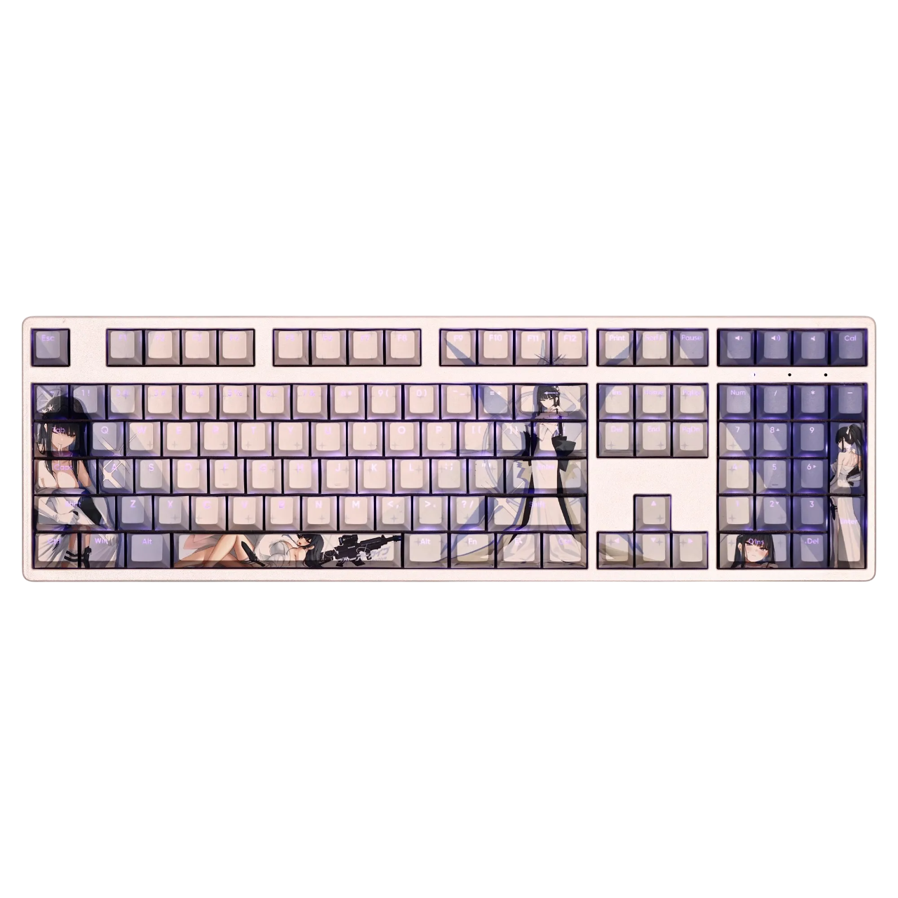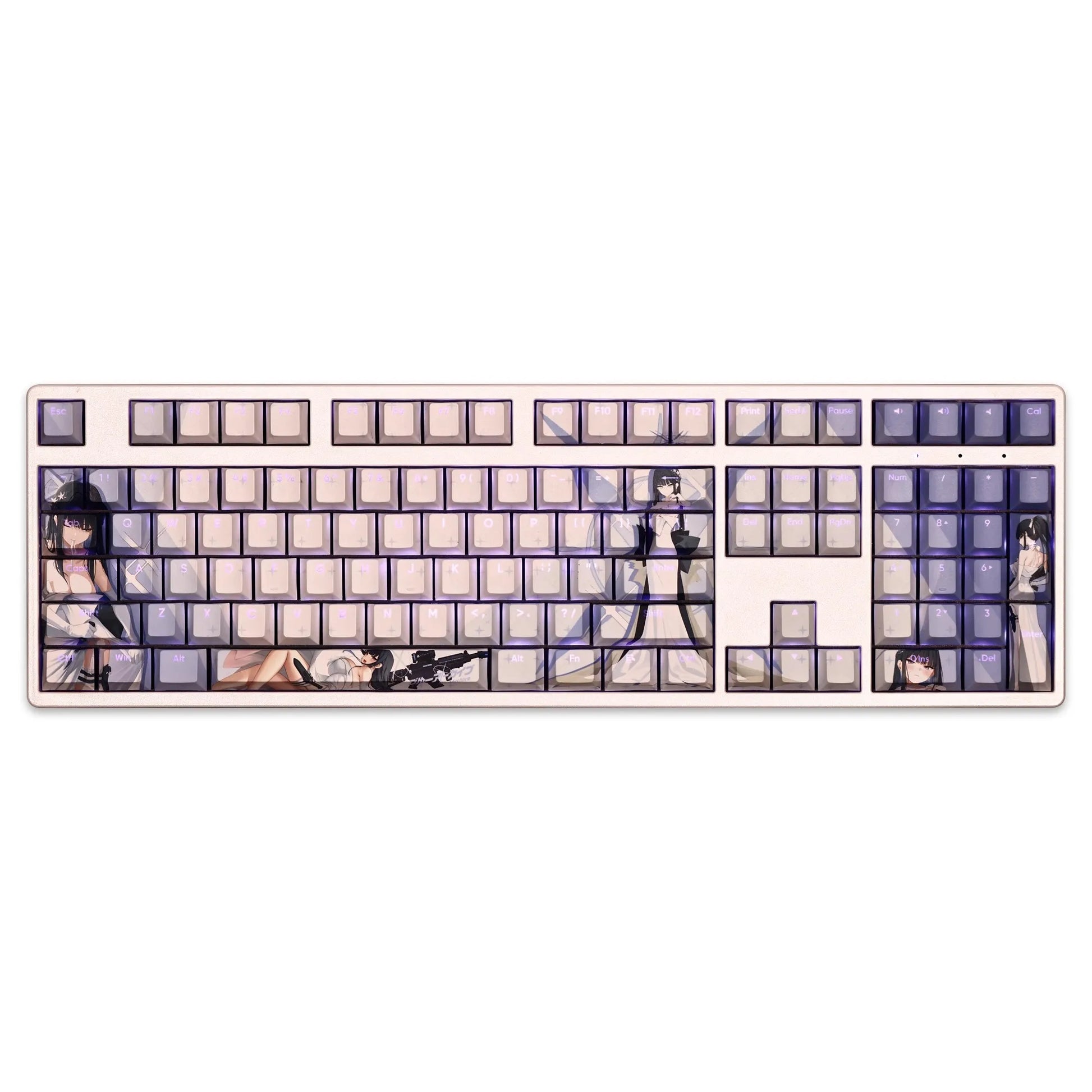 This mechanical keycaps set features various prints of Saori from the game "Blue Archive" that are bound together with cream and blue colouring, combined with Backlit keycaps, Saori illuminates when LEDs pass through the keycaps.