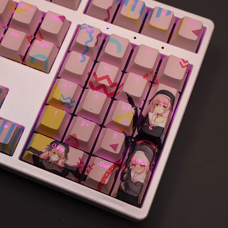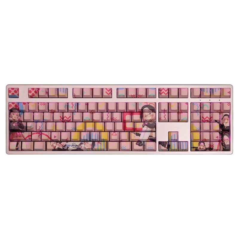 This mechanical keycaps set features various prints of Shimoe Koharu from the mobile game "Blue Archive" that are bound together with pink, blue and red colouring, combined with Backlit keycaps, Shimoe Koharu illuminates when LEDs pass through the keycaps.