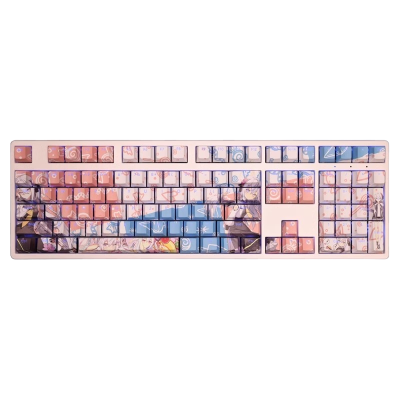 This mechanical keycaps set features various prints of Shirasu Azusa from the game "Blue Archive" that are bound together with white, pink and blue colouring, combined with Backlit keycaps, Shirasu Azusa illuminates when LEDs pass through the keycaps.