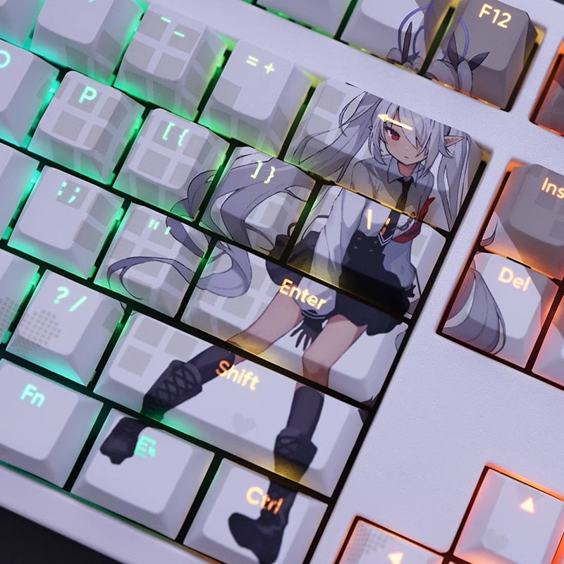 This mechanical keycaps set features various prints of Shiromi Iori from the game "Blue Archive" that are bound together with white, blue and grey colouring, combined with Backlit keycaps, Shiromi Iori illuminates when LEDs pass through the keycaps.