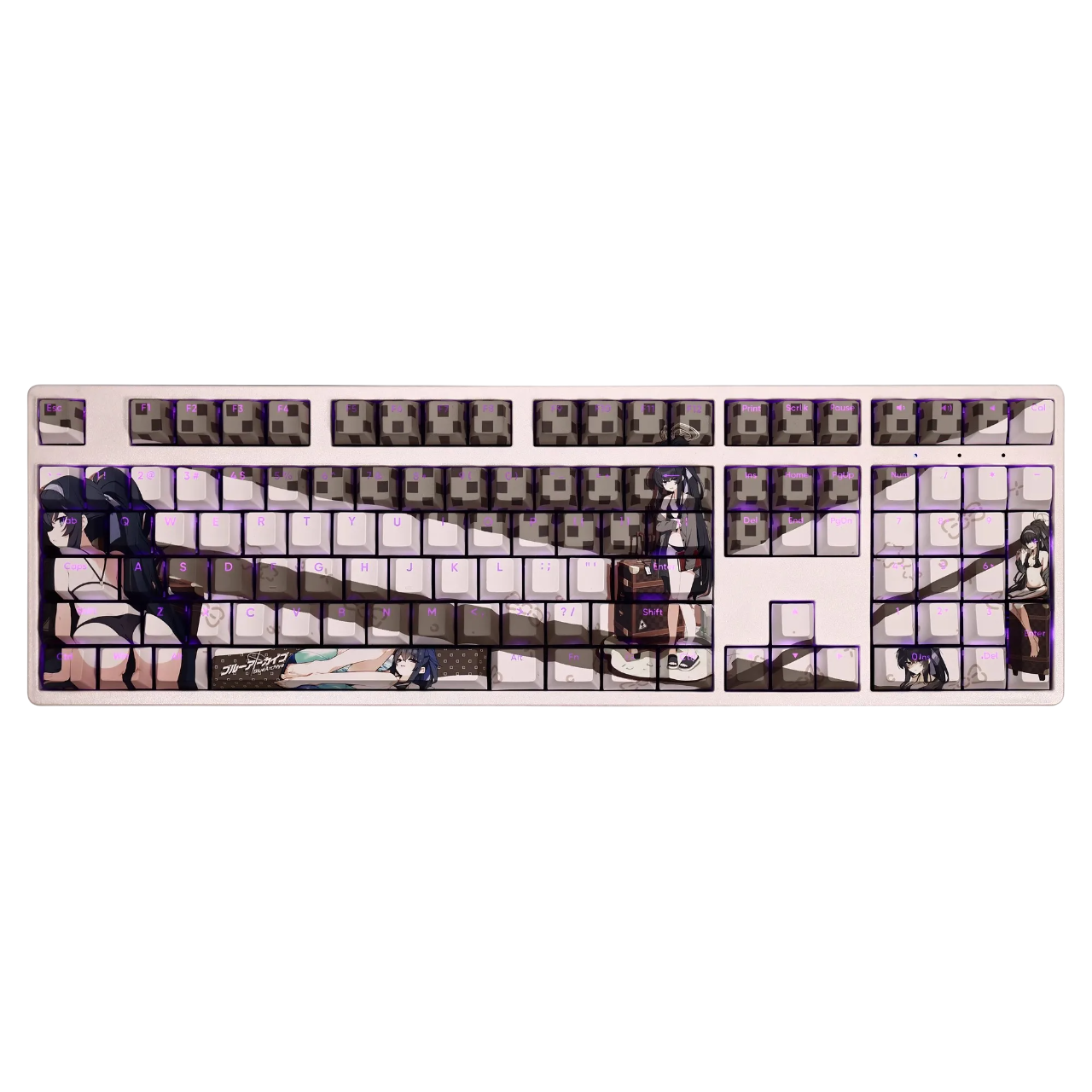 This mechanical keycaps set features various prints of Ui from the game "Blue Archive" that are bound together with brown and white colouring, combined with Backlit keycaps, Ui illuminates when LEDs pass through the keycaps.