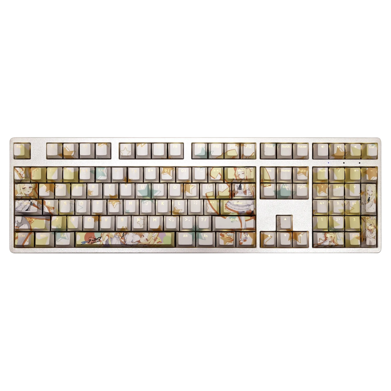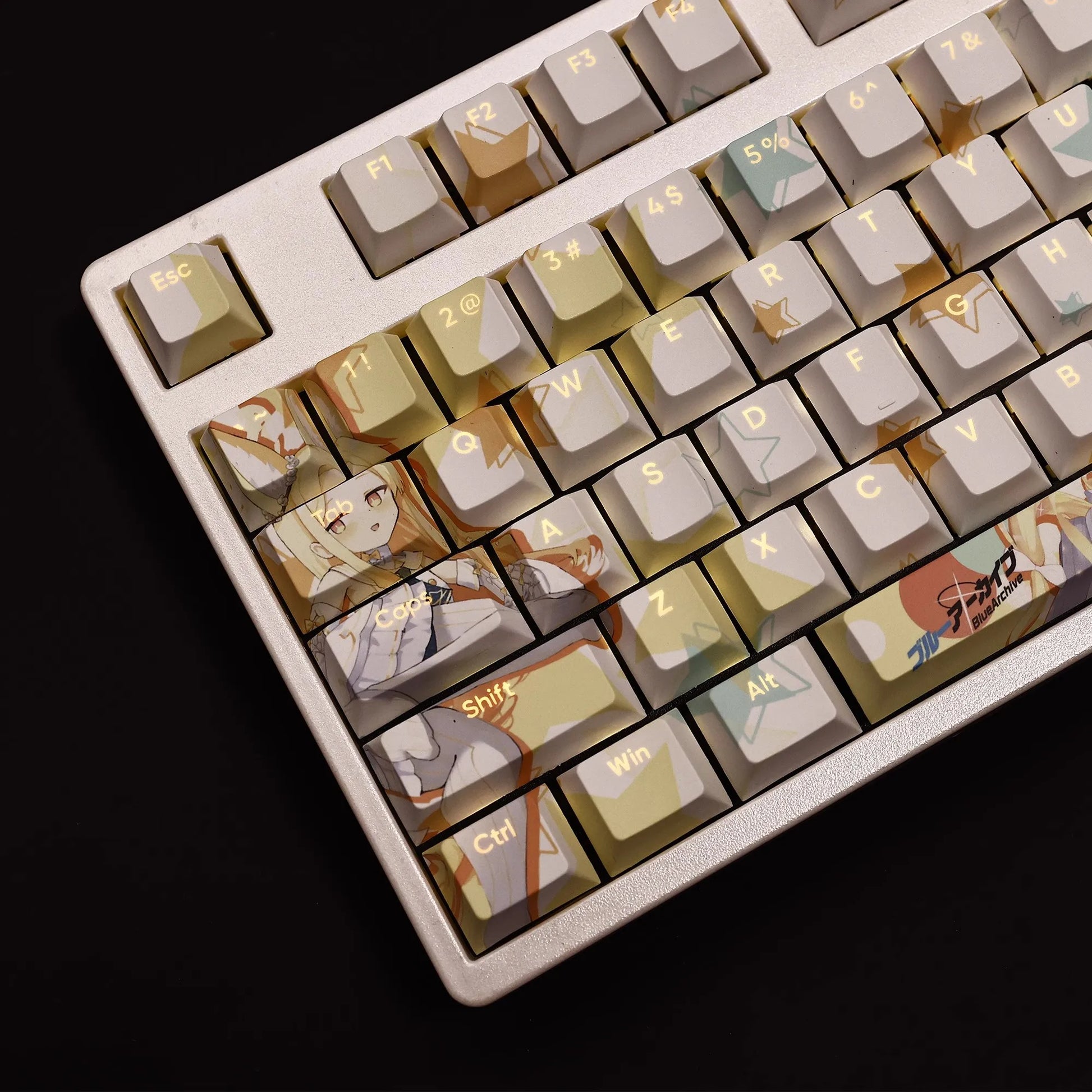This mechanical keycaps set features various prints of Yurizono Seia from the game "Blue Archive" that are bound together with white and yellow colouring, combined with Backlit keycaps, Yurizono Seia illuminates when LEDs pass through the keycaps.