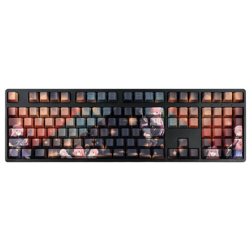 This mechanical keycaps set features various prints of Hitori Goto from the Anime "Bocchi The Rock!" that are bound together with black and orange colouring, combined with Backlit keycaps, Hitori Goto illuminates when LEDs pass through the keycaps.