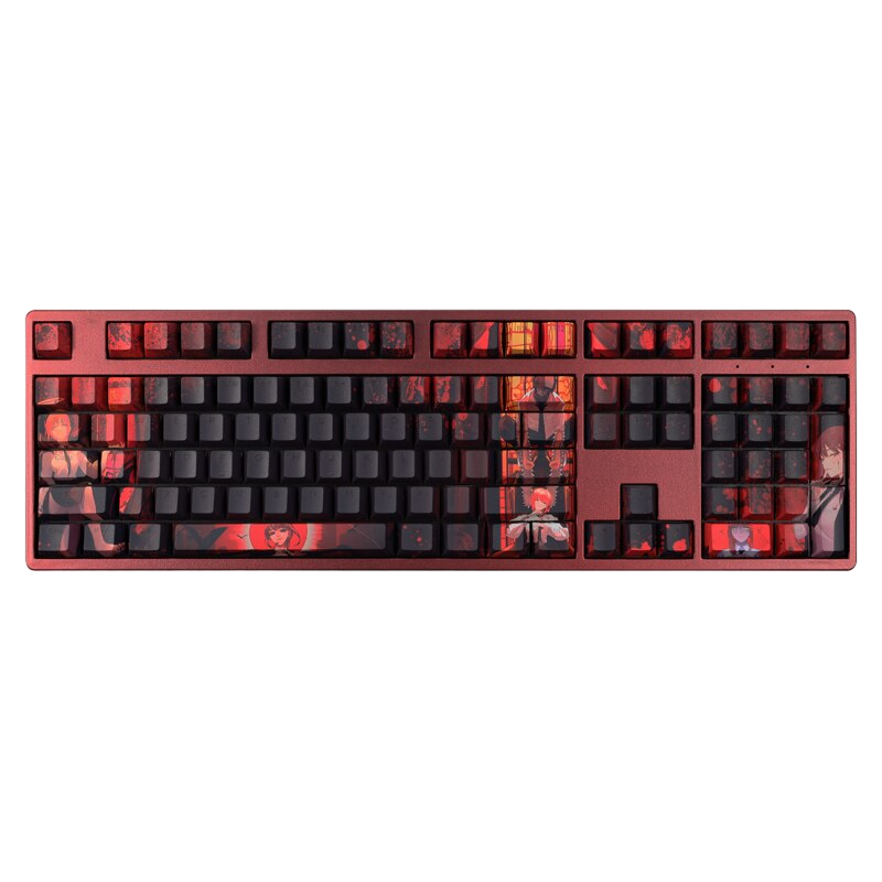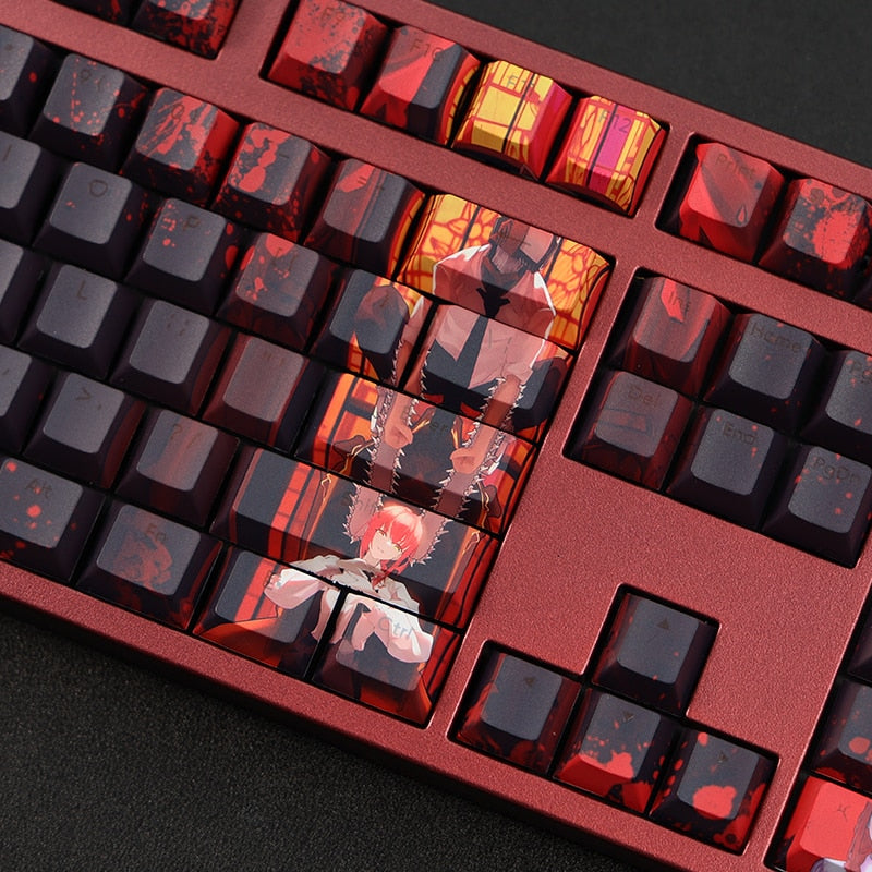 This mechanical keycaps set features various prints of Makima from the anime "Chainsaw Man" that are bound together with black and red colouring, combined with Backlit keycaps, Makima illuminates when LEDs pass through the keycaps.