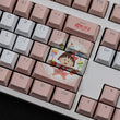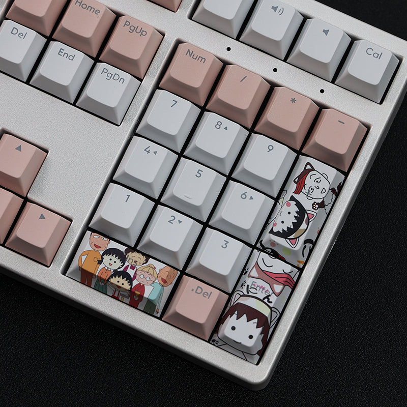 This mechanical keycaps set features various prints of characters from the anime "Chibi Maruko-chan" that are bound together with white and pink colouring.