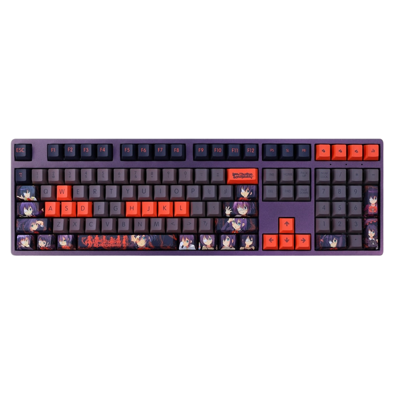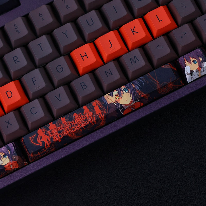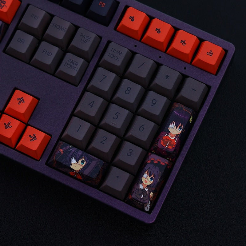This mechanical keycaps set features various prints of Rikka Takanashi from the anime "Chunibyo" that are bound together with black and orange colouring.