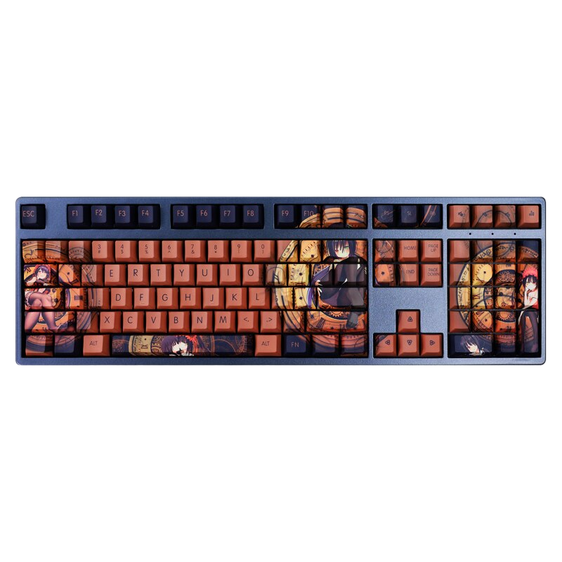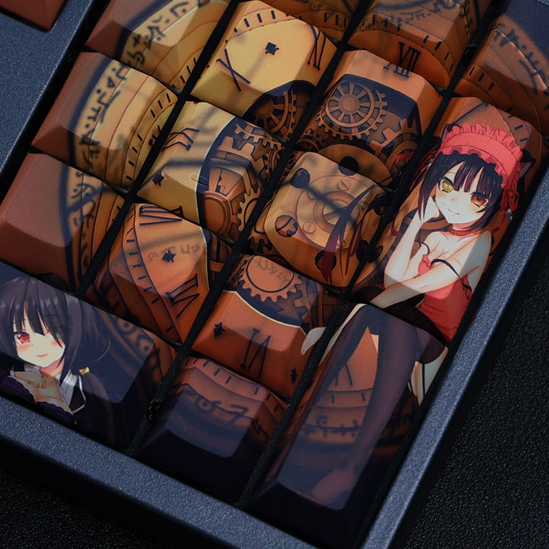 This mechanical keycaps set features various prints of Kurumi Tokisaki from the anime "Date A Live" that are bound together with orange colouring.
