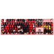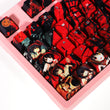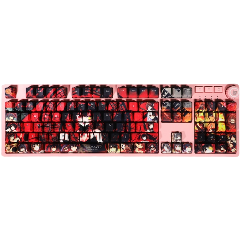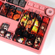 This mechanical keycaps set features various prints of Kurumi Tokisaki from the anime "Date A Live" that are bound together with red and black colouring.