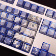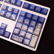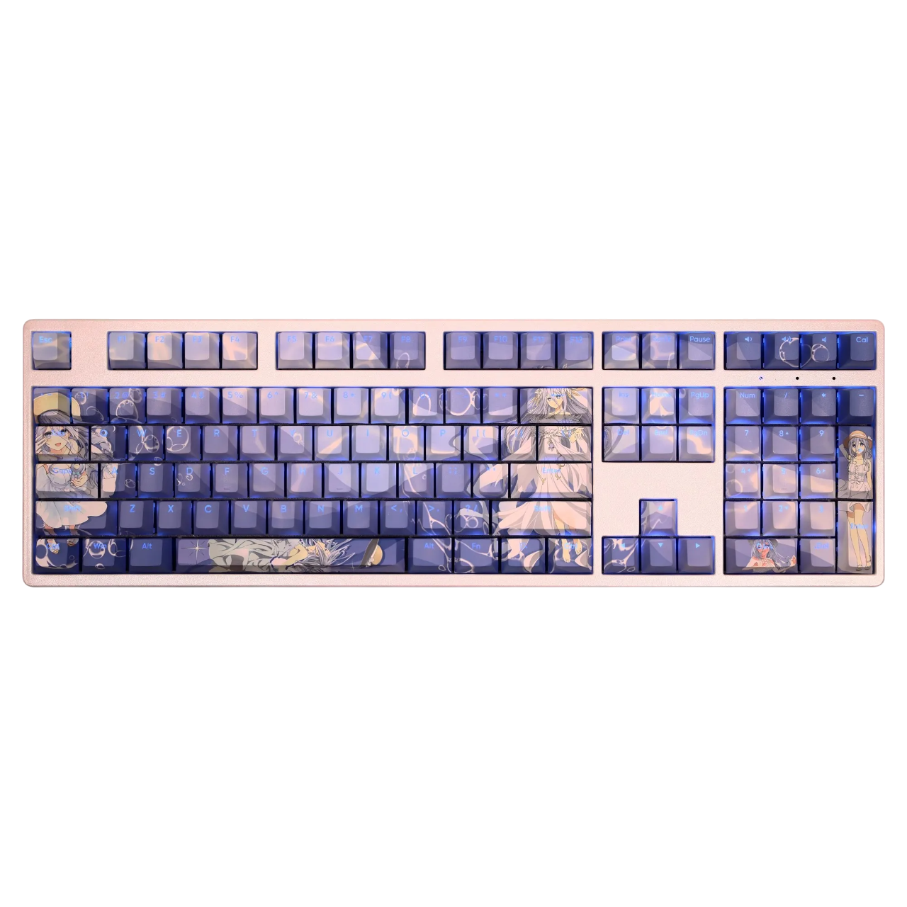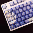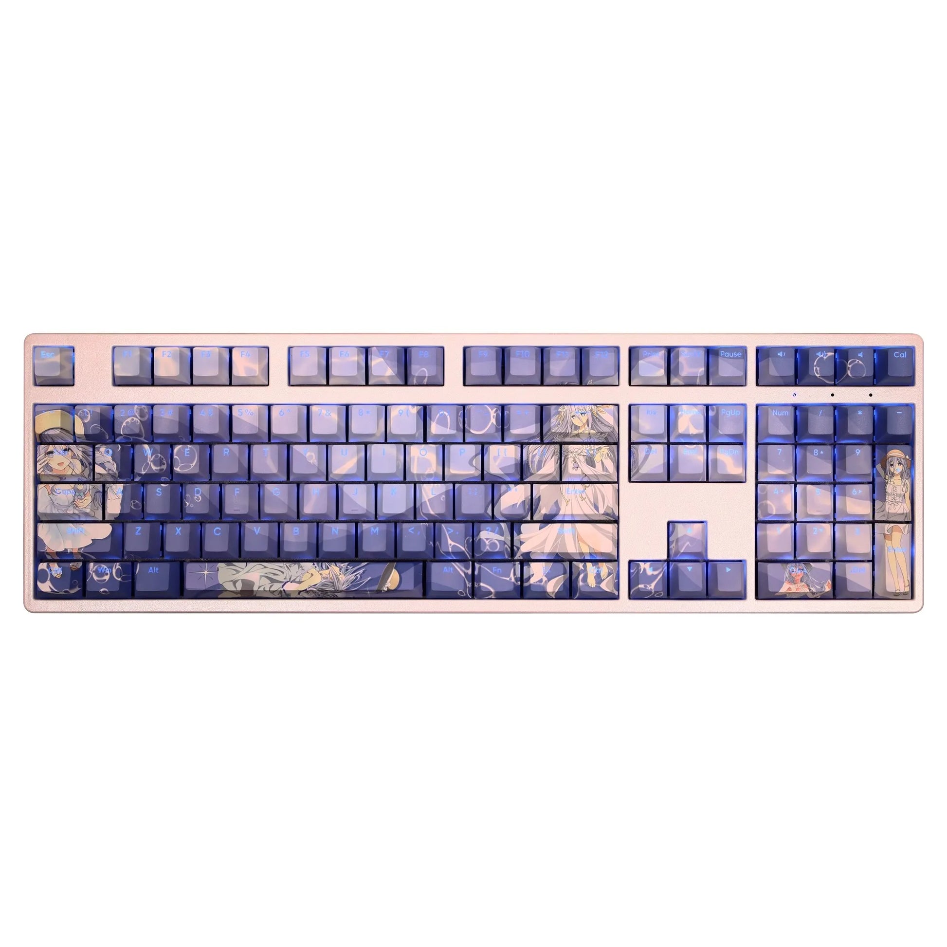 This mechanical keycaps set features various prints of Takamiya Mio from the anime "Date A Live" that are bound together with blue colouring, combined with Backlit keycaps, Takamiya Mio illuminates when LEDs pass through the keycaps.