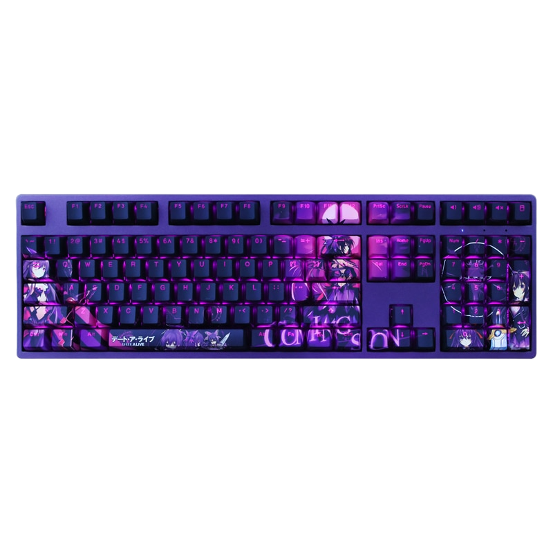 This mechanical keycaps set features various prints of Tohka Yatogami from the anime "Date A Live" that are bound together with purple colouring, combined with Backlit keycaps, Tohka Yatogami illuminates when LEDs pass through the keycaps.