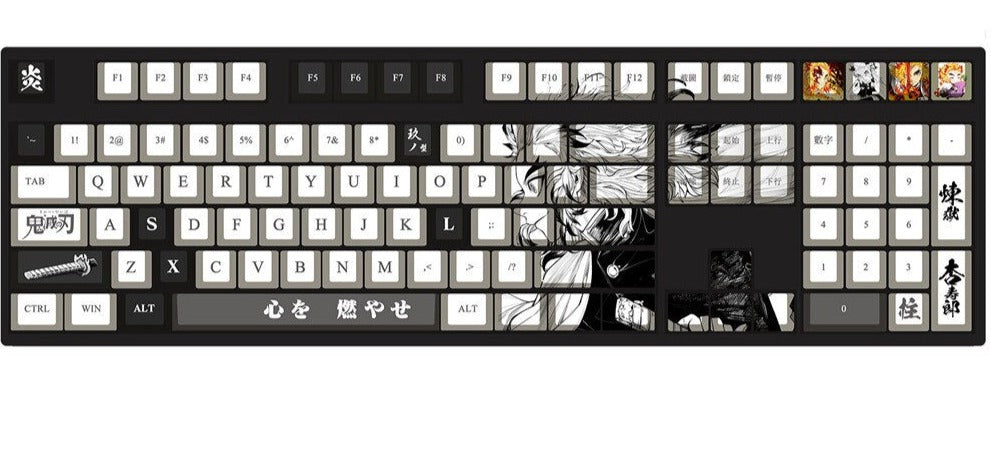 This mechanical keycaps set features various prints of Kyojuro Rengoku from the anime "Demon Slayer" that are bound together with black and white colouring.