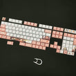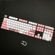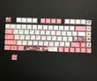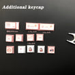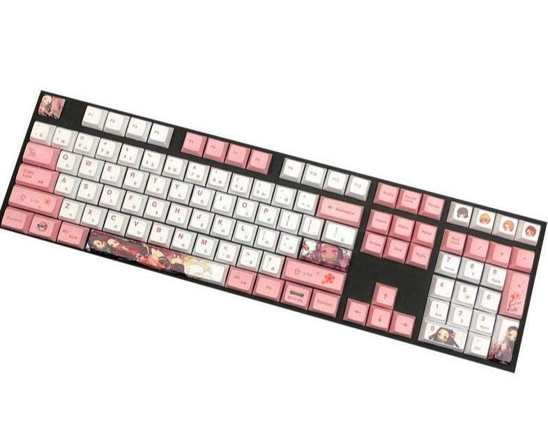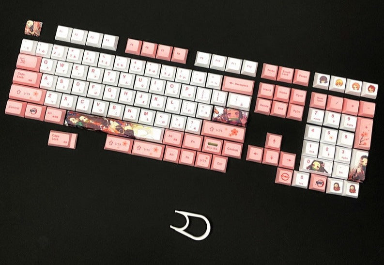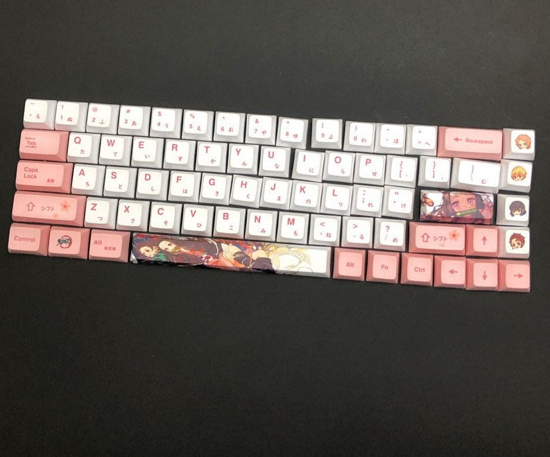 This mechanical keycaps set features various prints of Nezuko Kamado from the anime "Demon Slayer" that are bound together with white and pink colouring.
