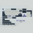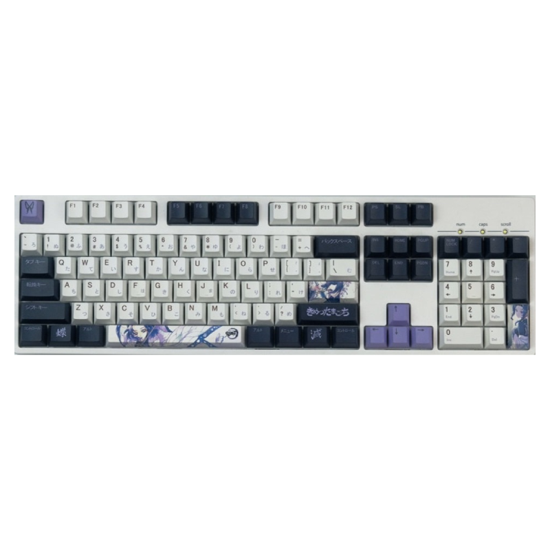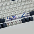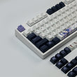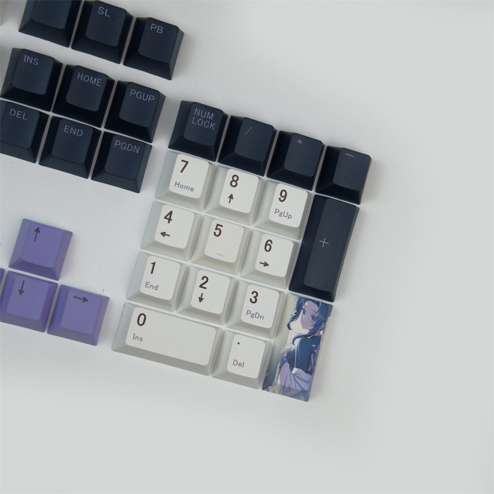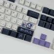 This mechanical keycaps set features various prints of Shinobu Kocho from the anime "Demon Slayer" that are bound together with blue and white colouring.