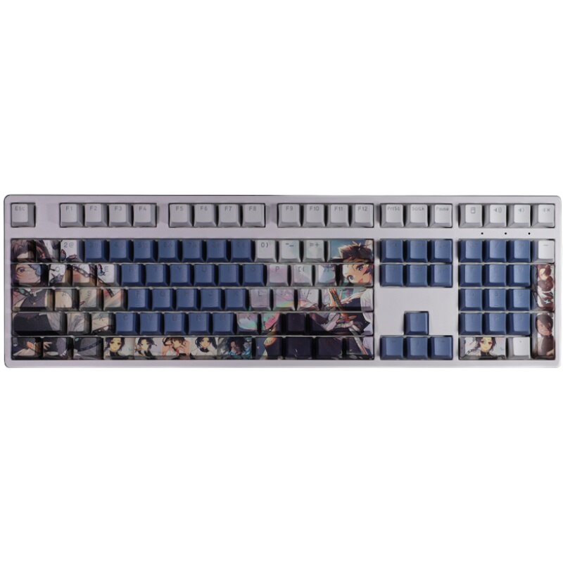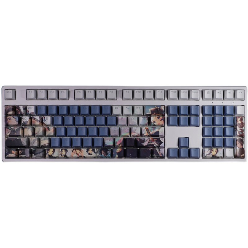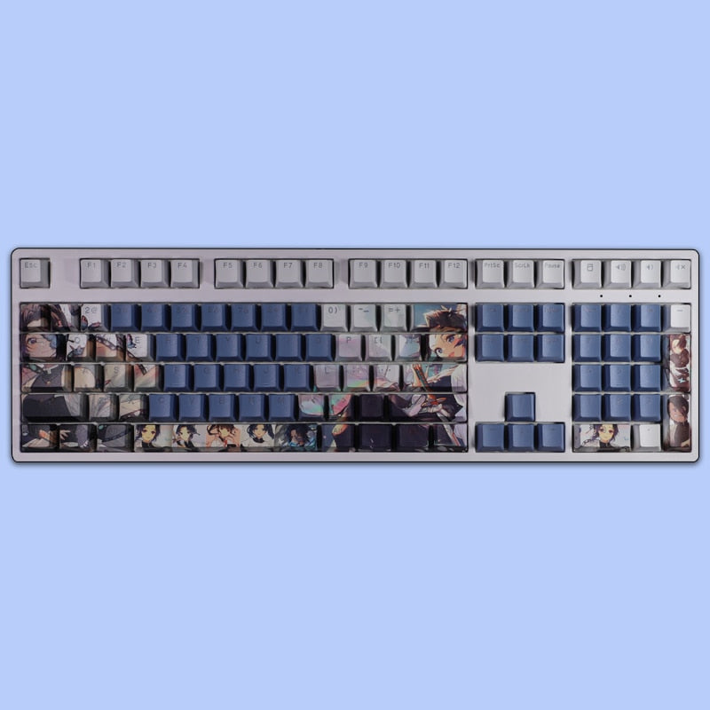This mechanical keycaps set features various prints of Shinobu Kocho from the anime "Demon Slayer" that are bound together with blue and white colouring, combined with Backlit keycaps, Shinobu Kocho illuminates when LEDs pass through the keycaps.