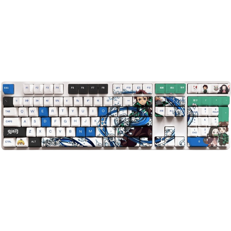 This mechanical keycaps set features various prints of Tanjiro Kamado from the anime "Demon Slayer" that are bound together with white and blue colouring.