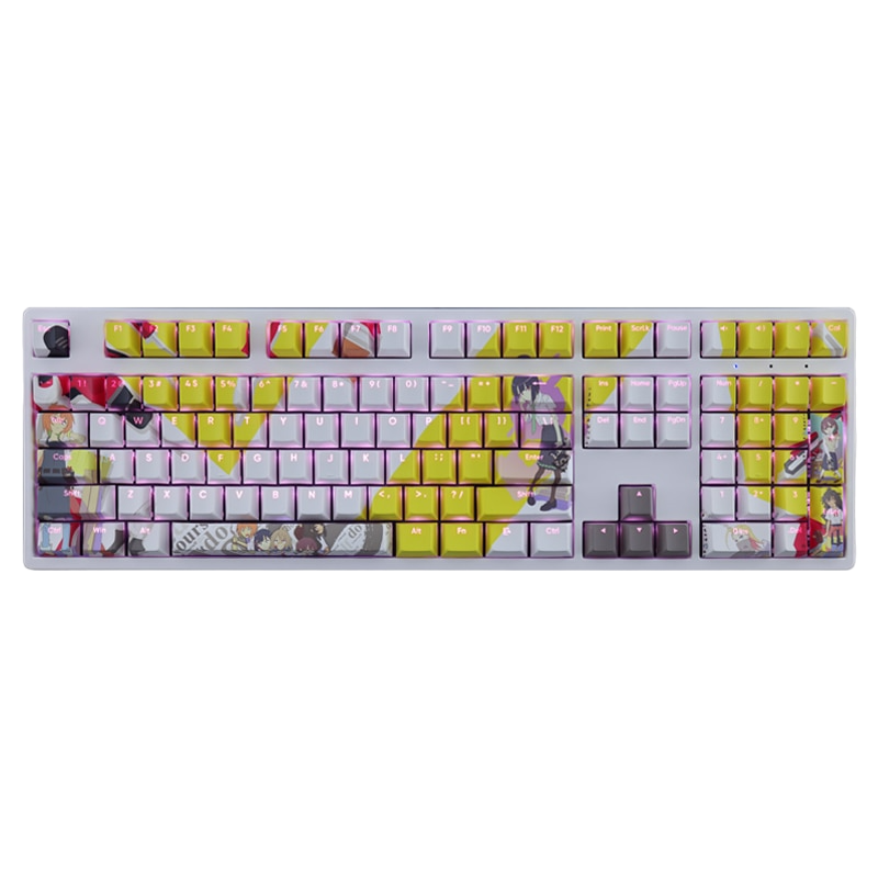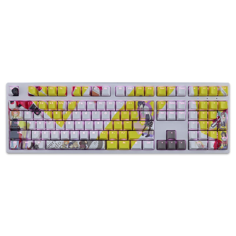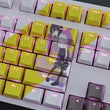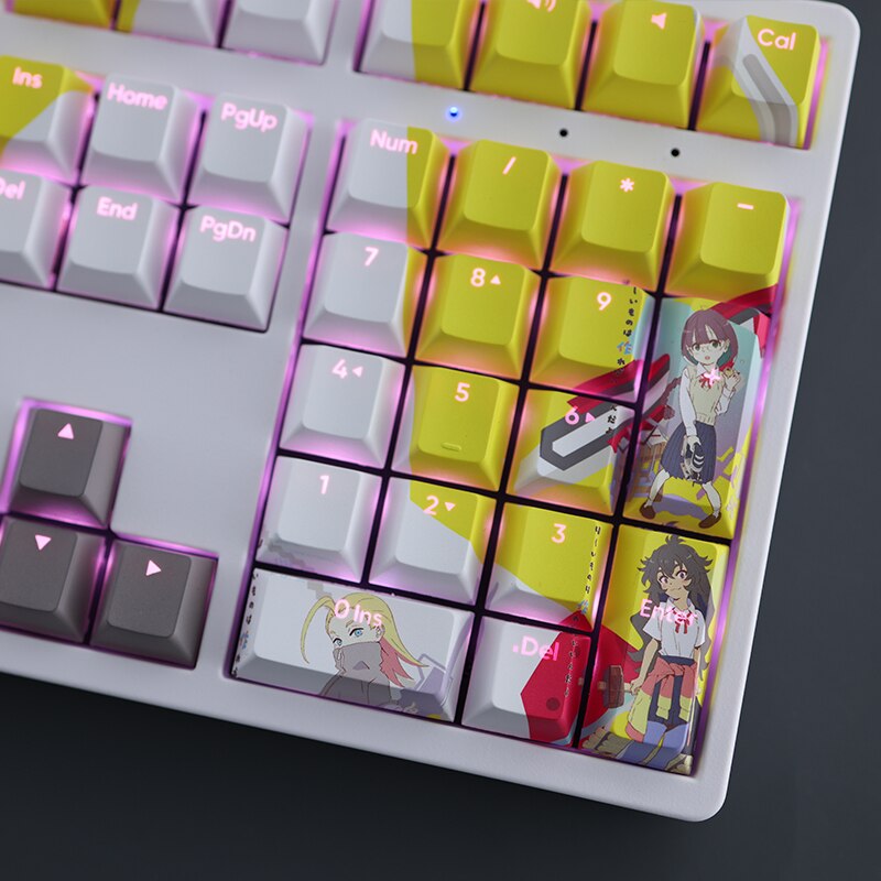 This mechanical keycaps set features various prints of characters from the anime "Do It Yourself!!" bound together with white, yellow and pink colouring, combined with Backlit keycaps, the characters illuminate when LEDs pass through the keycaps.