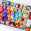 This mechanical keycaps set features various prints of characters from the anime "Dragon Ball" that are bound together with rainbow colouring.