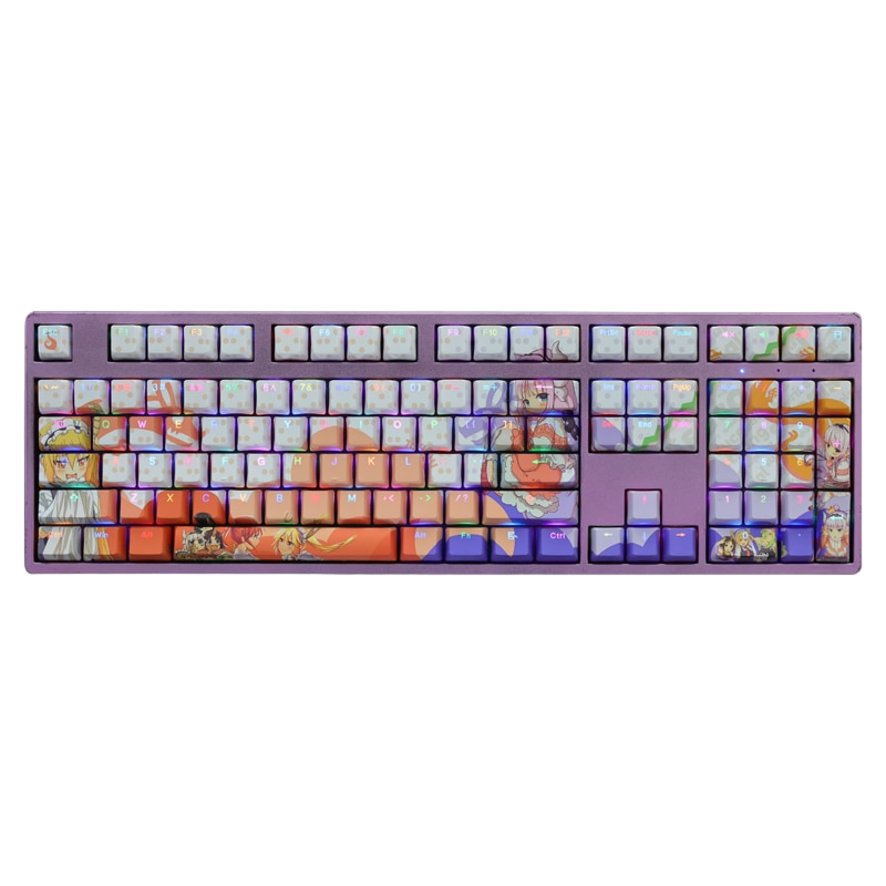 This mechanical keycaps set features various prints of characters from the anime "Dragon Maid" that are bound together with white, orange and blue colouring, combined with Backlit keycaps, the characters illuminate when LEDs pass through the keycaps.