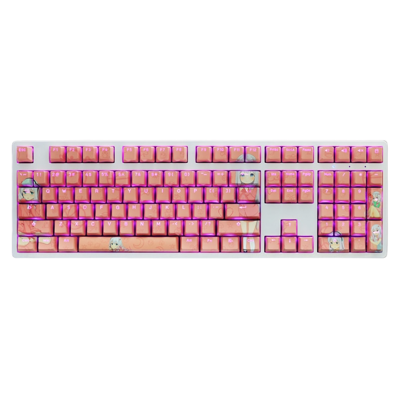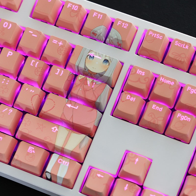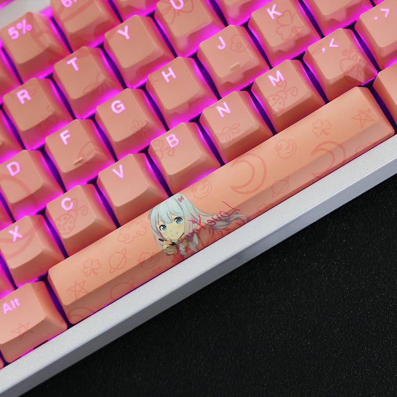 This mechanical keycaps set features various prints of Sagiri Izumi from the anime "Eromanga Sensei" that are bound together with orange colouring, combined with Backlit keycaps, Sagiri Izumi illuminates when LEDs pass through the keycaps.