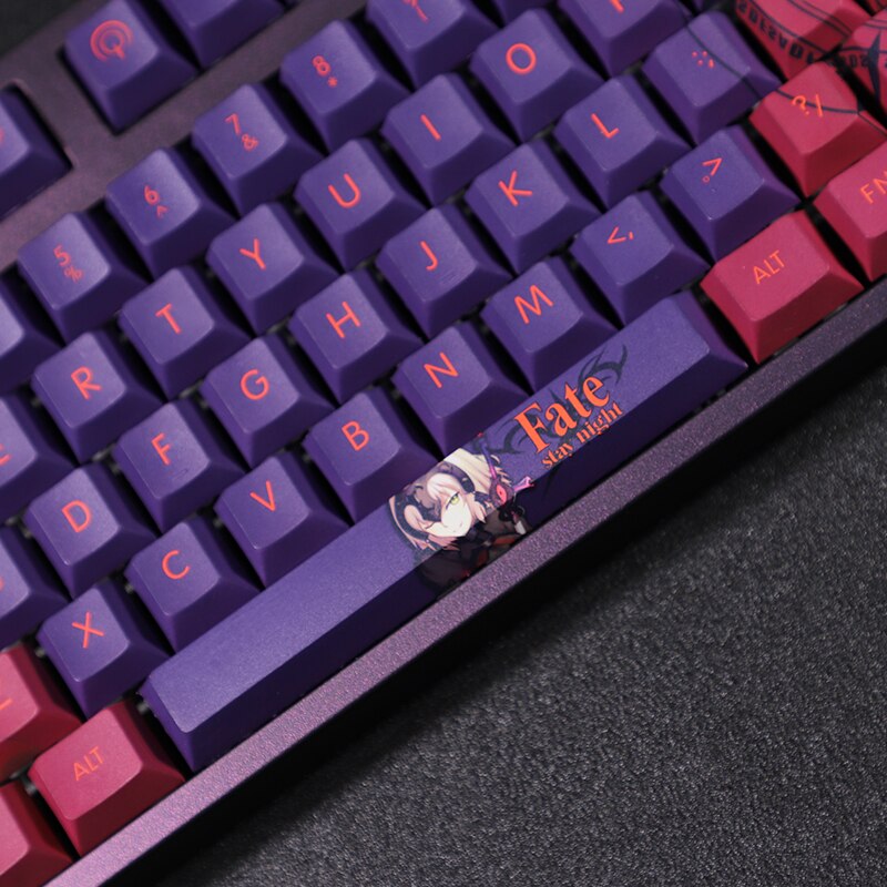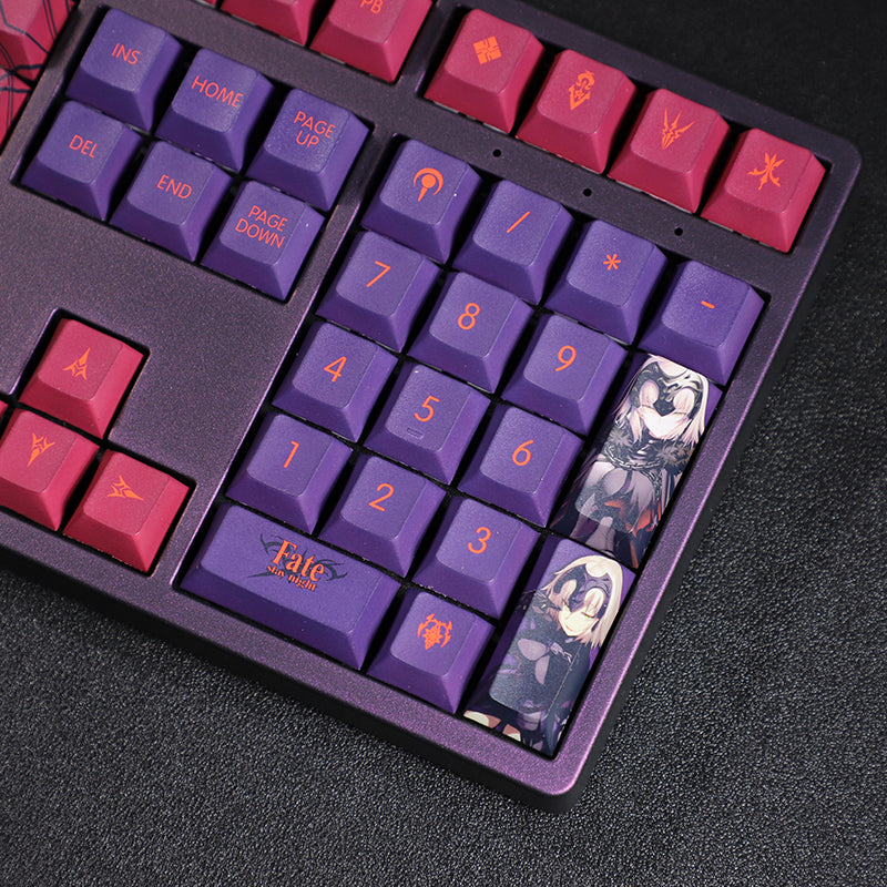 This mechanical keycaps set features various prints of Jeanne from the mobile game "Fate" that are bound together with purple and red colouring.