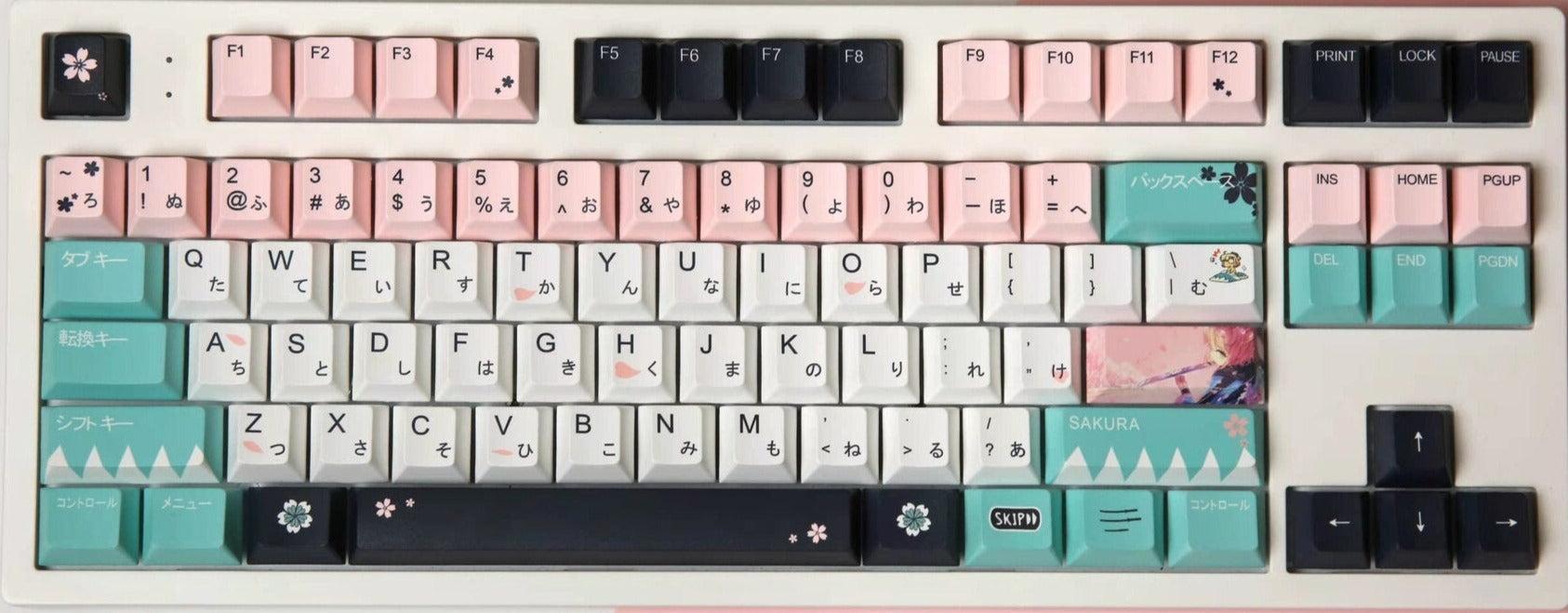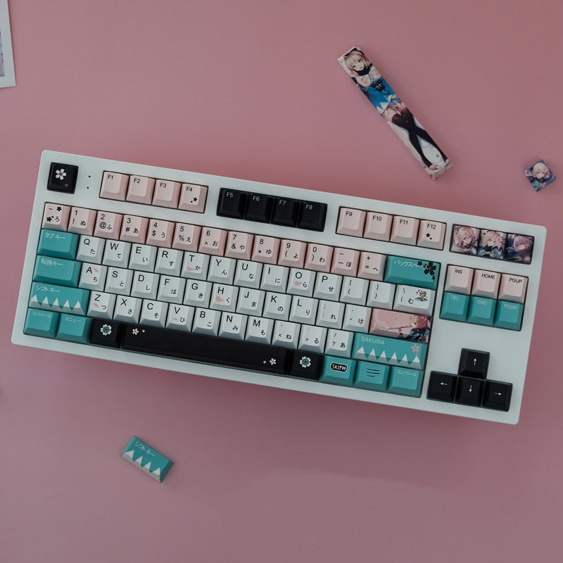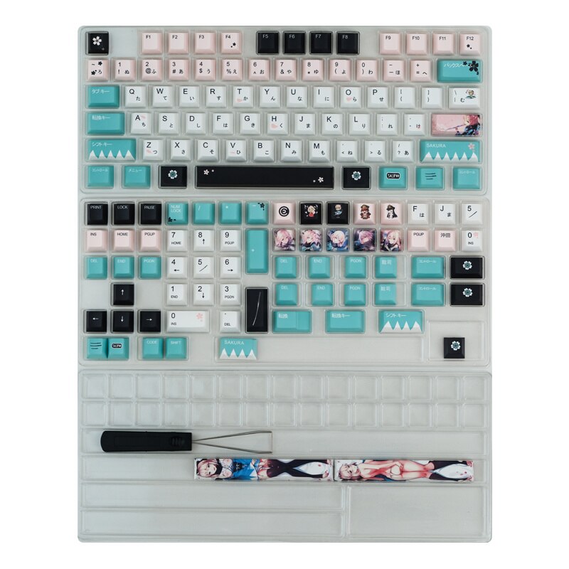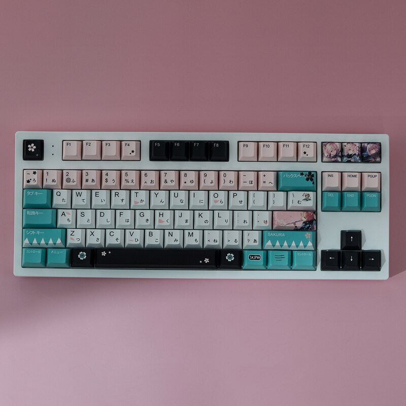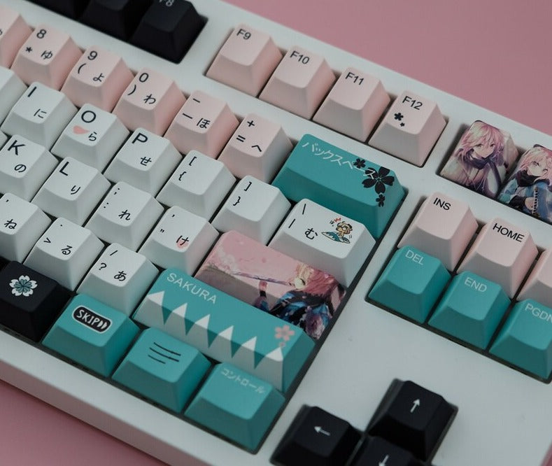 This mechanical keycaps set features various prints of Okita Souji from the mobile game "Fate" that are bound together with blue, pink, white and black colouring.