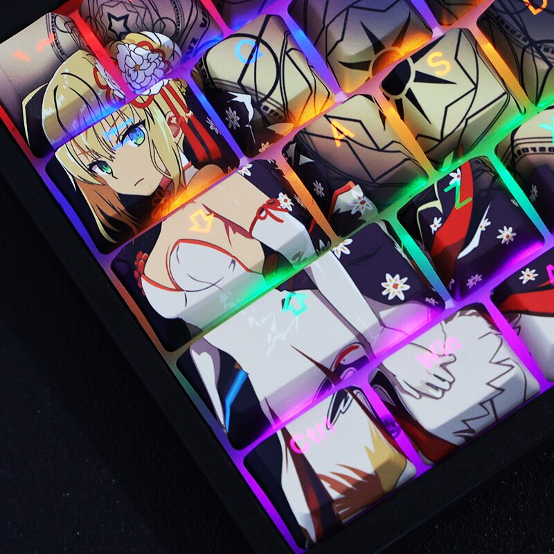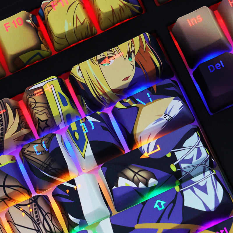 This mechanical keycaps set features various prints of Saber from the mobile game "Fate" that are bound together with dark blue and yellow colouring, combined with Backlit keycaps, Saber illuminates when LEDs pass through the keycaps.