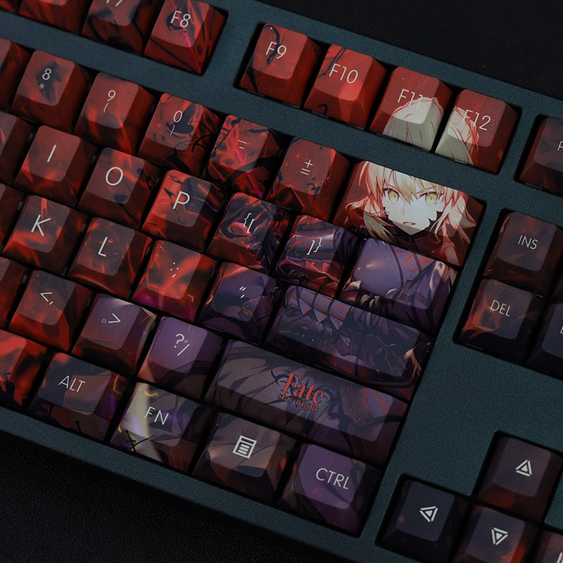 This mechanical keycaps set features various prints of Saber from the mobile game "Fate" that are bound together with black and red colouring.
