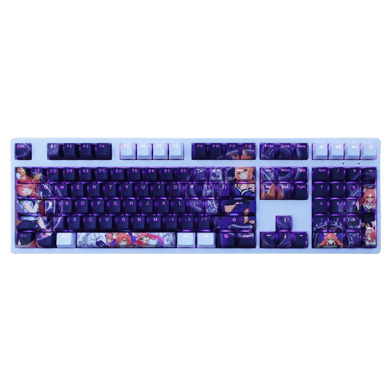 This mechanical keycaps set features various prints of Tamamo-no-Mae from the mobile game "Fate" that are bound together with dark blue colouring, combined with Backlit keycaps, Tamamo-no-Mae illuminates when LEDs pass through the keycaps.
