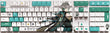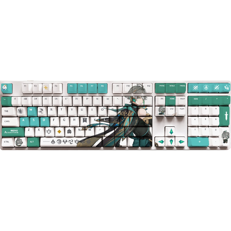 This mechanical keycaps set features various prints of Alhaitham from the game "Genshin Impact" that are bound together with white, blue and green colouring.
