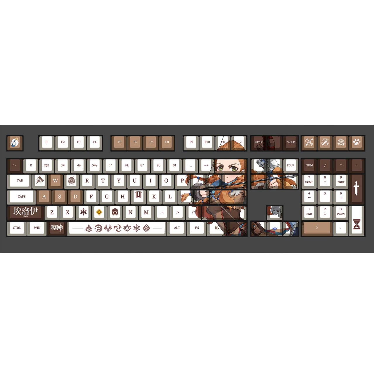 This mechanical keycaps set features various prints of Aloy from the game "Genshin Impact" that are bound together with white and brown colouring.