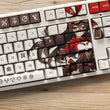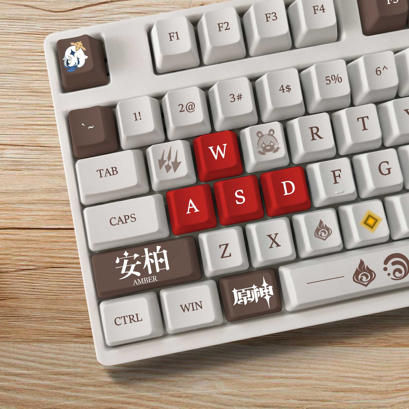 This mechanical keycaps set features various prints of Amber from the game "Genshin Impact" that are bound together with white, red and brown colouring.