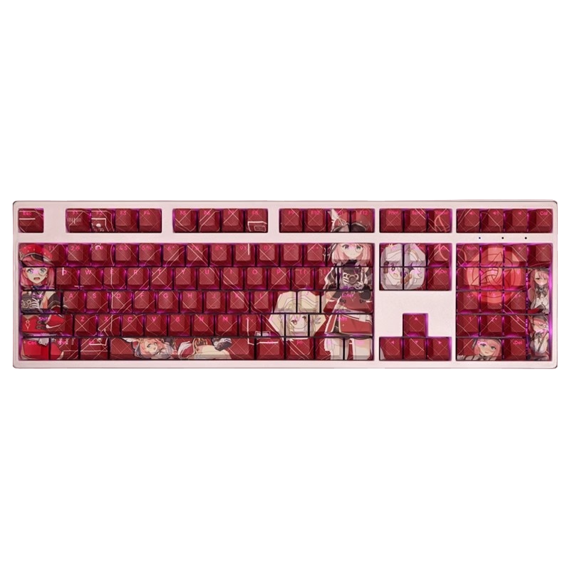 This mechanical keycaps set features various prints of Charlotte from the Game "Genshin Impact" that are bound together with red colouring, combined with Backlit keycaps, Charlotte illuminates when LEDs pass through the keycaps.