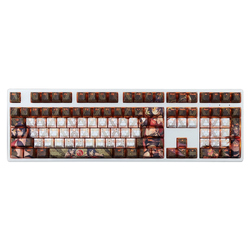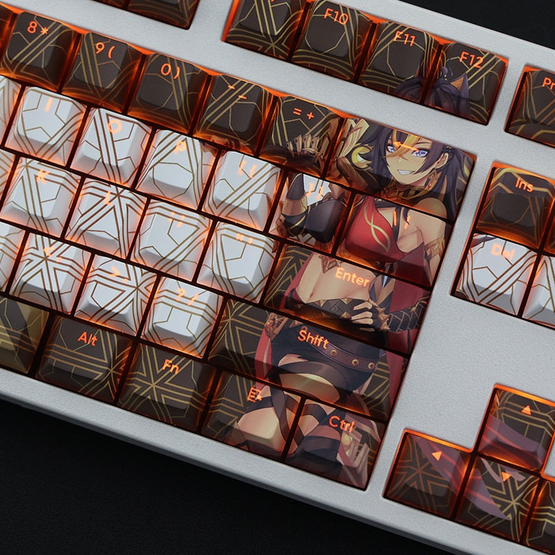 This mechanical keycaps set features various prints of Dehya from the Game "Genshin Impact" that are bound together with white and brown colouring, combined with Backlit keycaps, Dehya illuminates when LEDs pass through the keycaps.