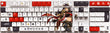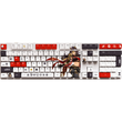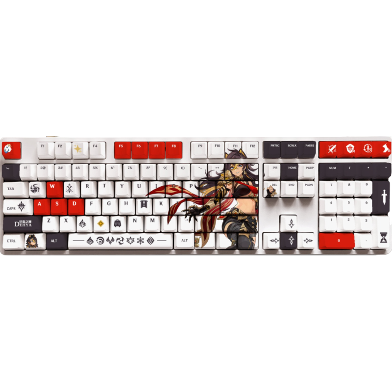 This mechanical keycaps set features various prints of Dehya from the game "Genshin Impact" that are bound together with white, red and black colouring.