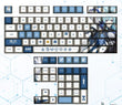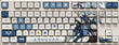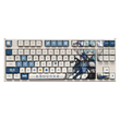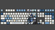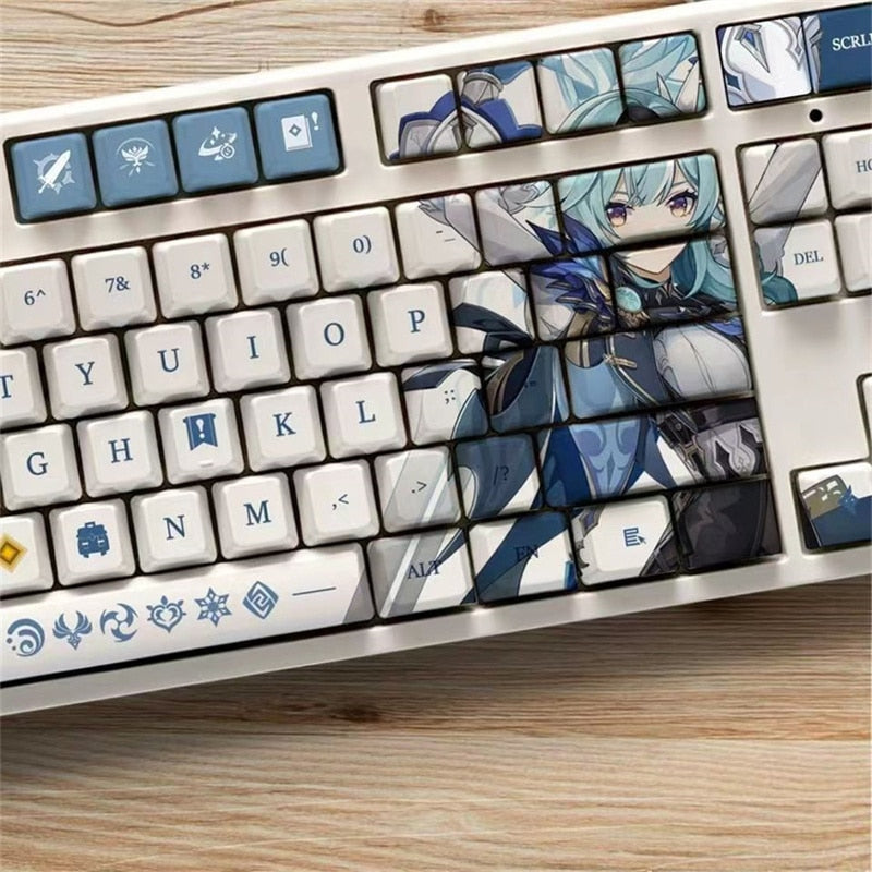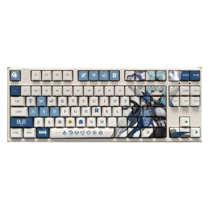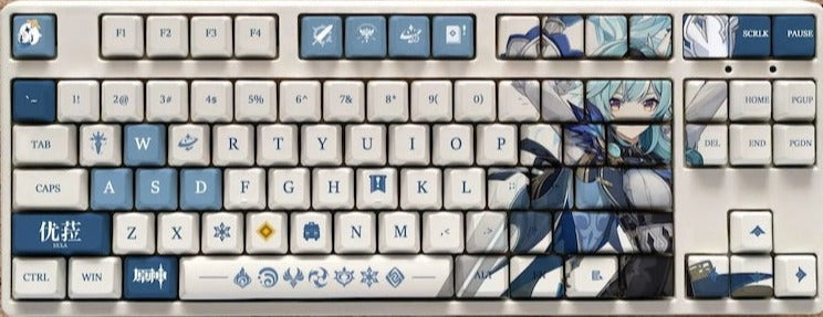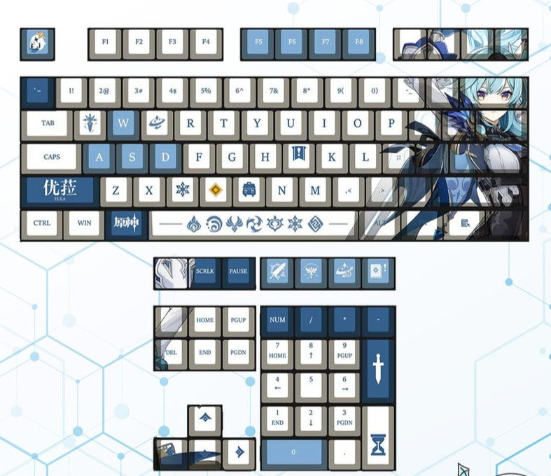 This mechanical keycaps set features various prints of Eula from the game "Genshin Impact" that are bound together with white and light blue colouring.