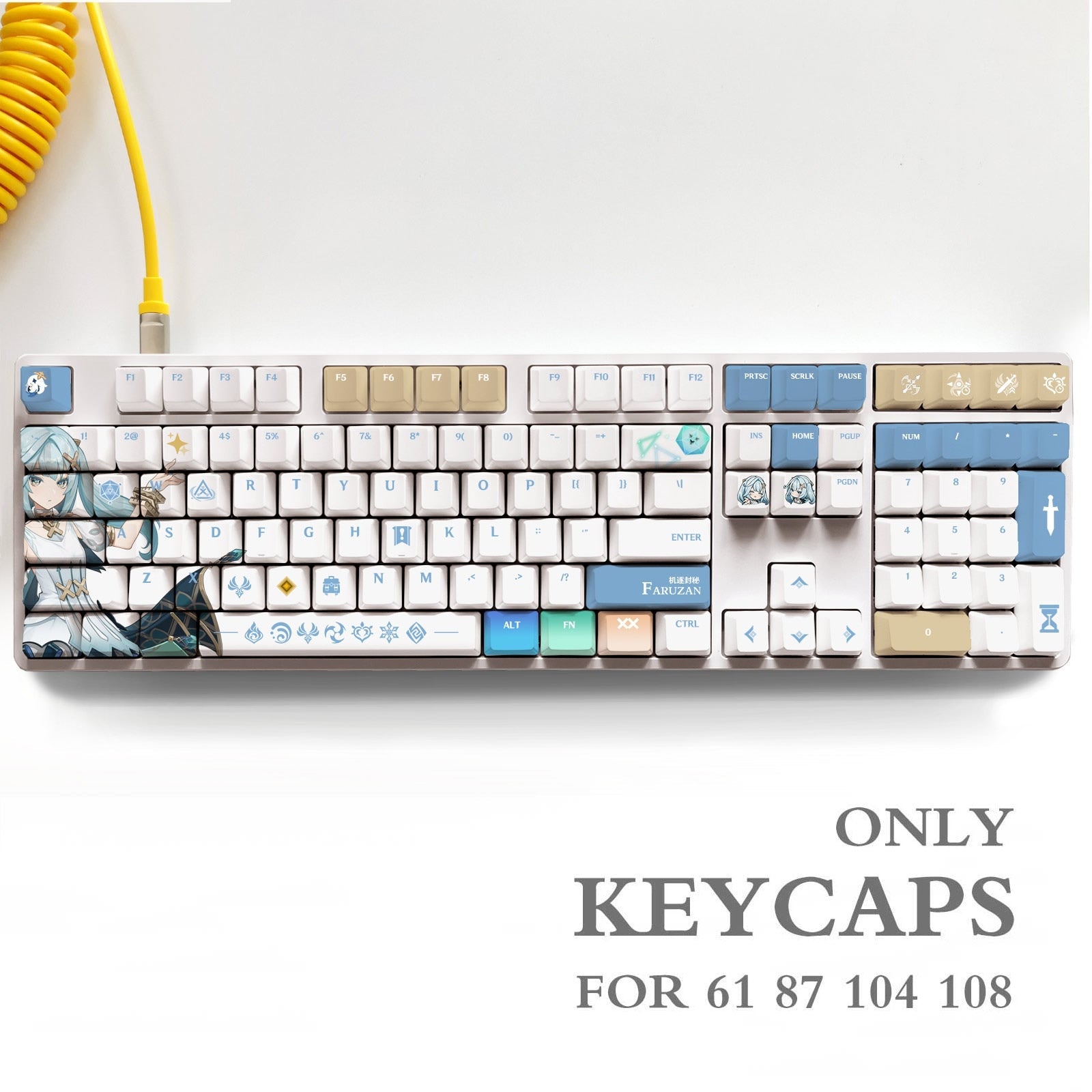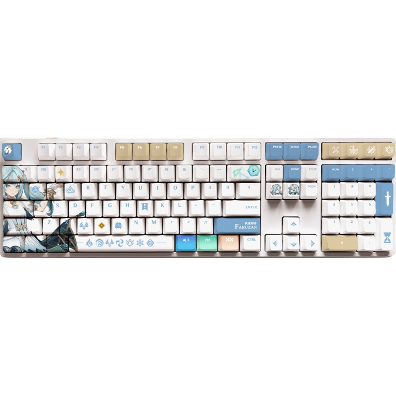 This mechanical keycaps set features various prints of Faruzan from the game "Genshin Impact" that are bound together with white and blue colouring.