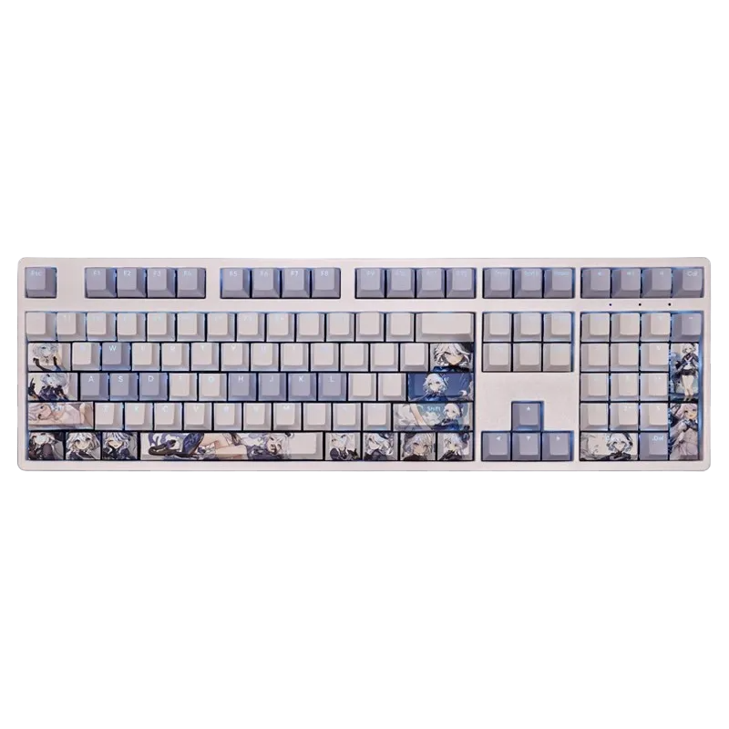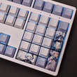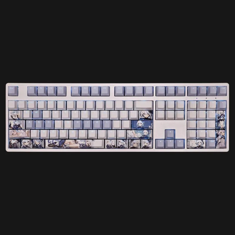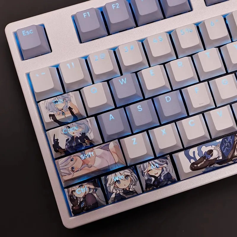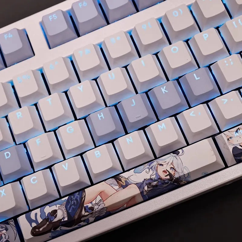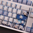 This mechanical keycaps set features various prints of Focalors from the Game "Genshin Impact" that are bound together with white and blue colouring, combined with Backlit keycaps, Focalors illuminates when LEDs pass through the keycaps.