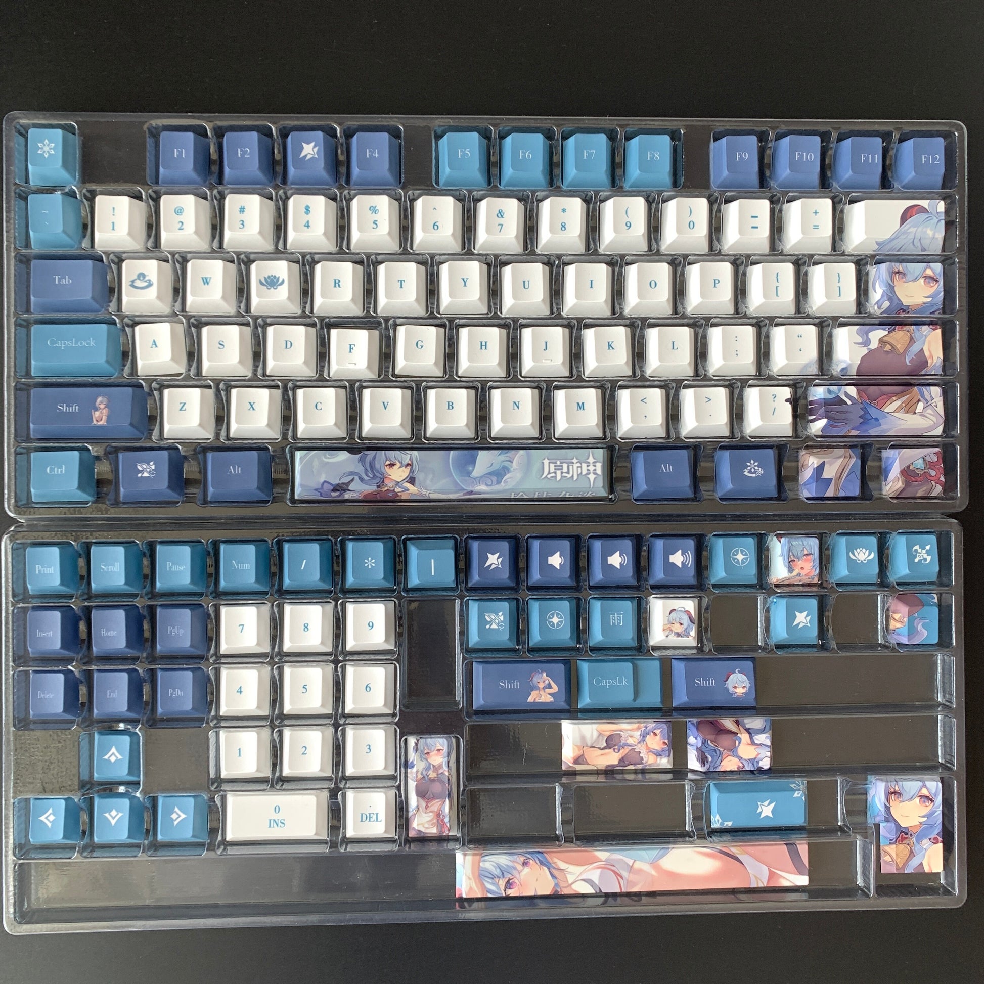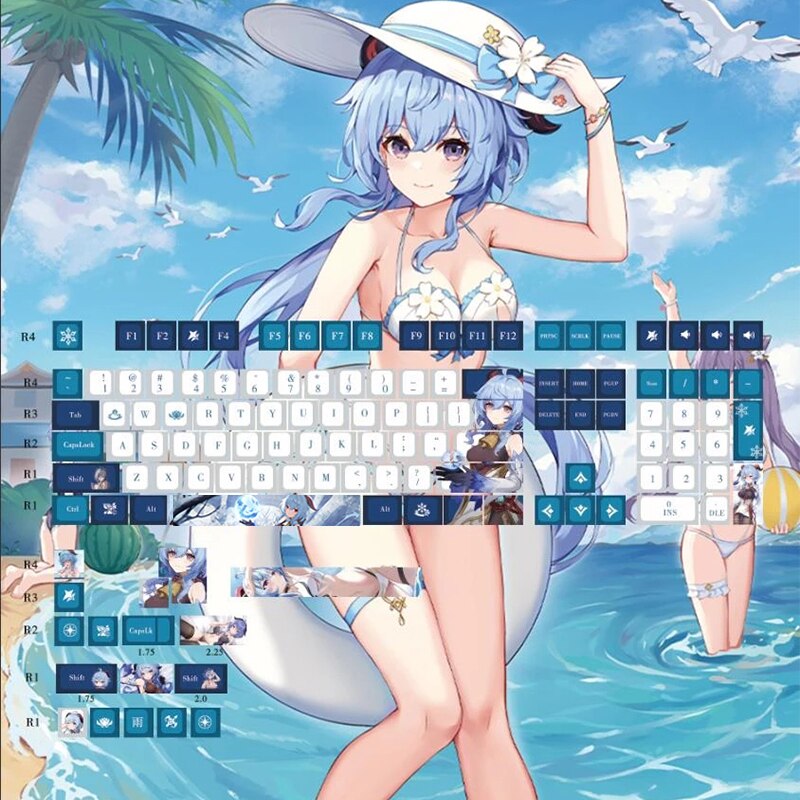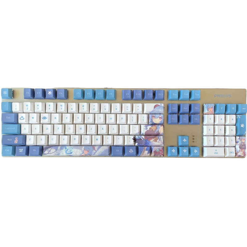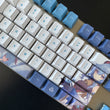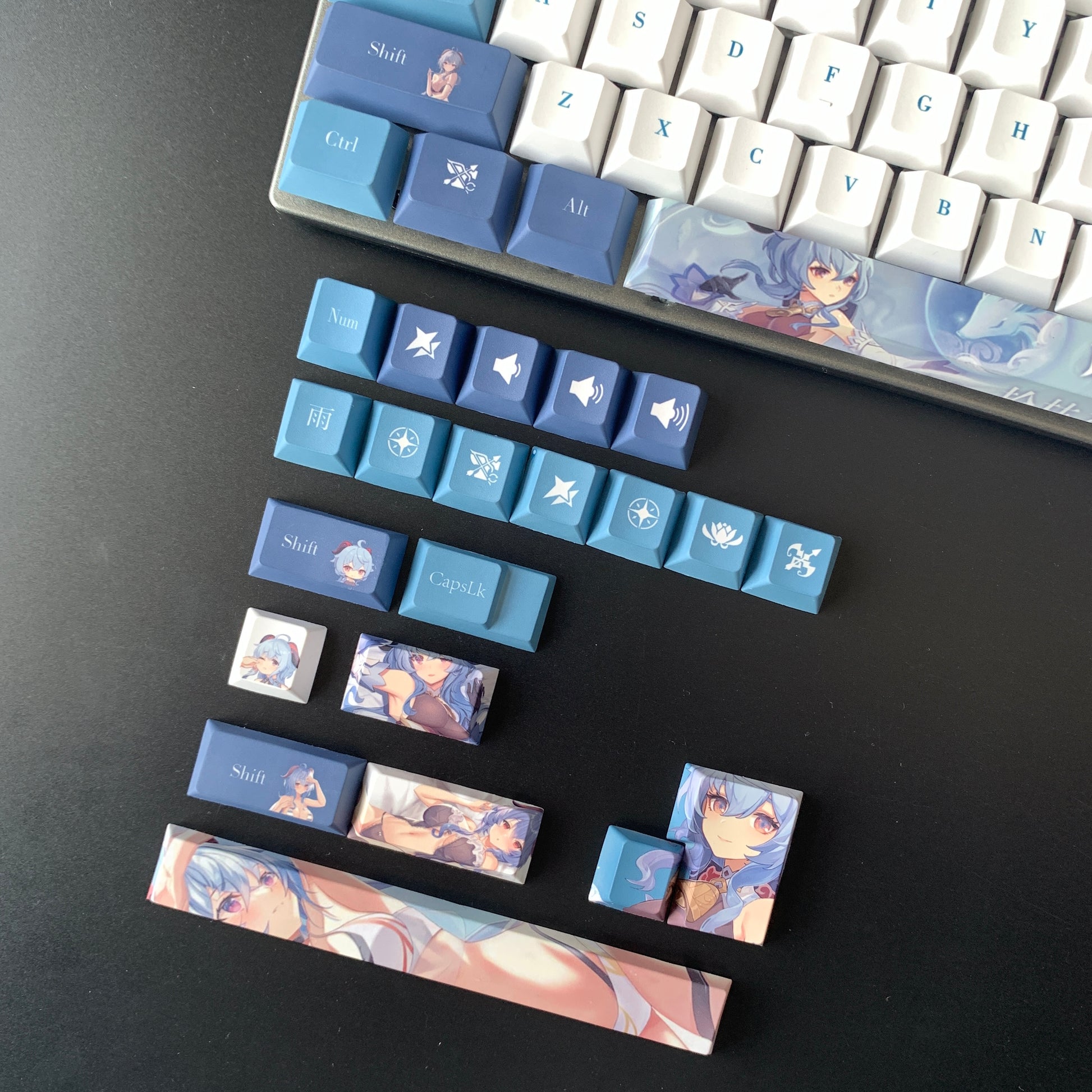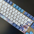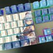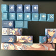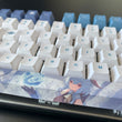 This mechanical keycaps set features various prints of Ganyu from the game "Genshin Impact" that are bound together with blue and white colouring.