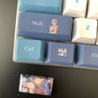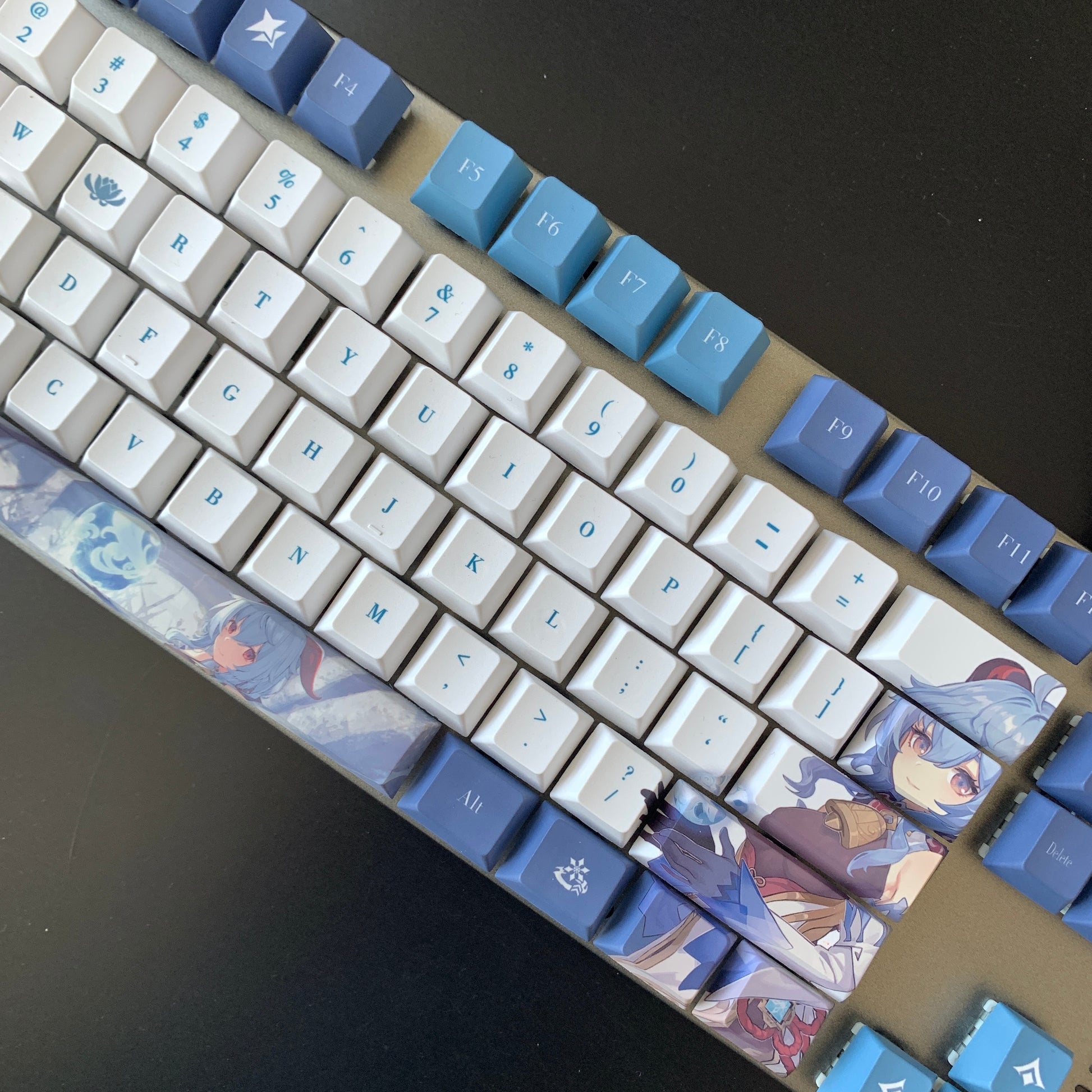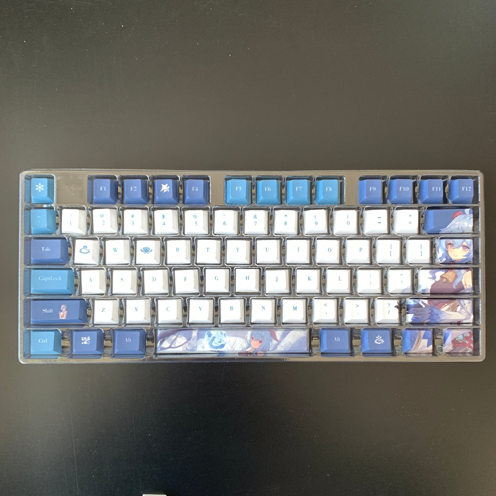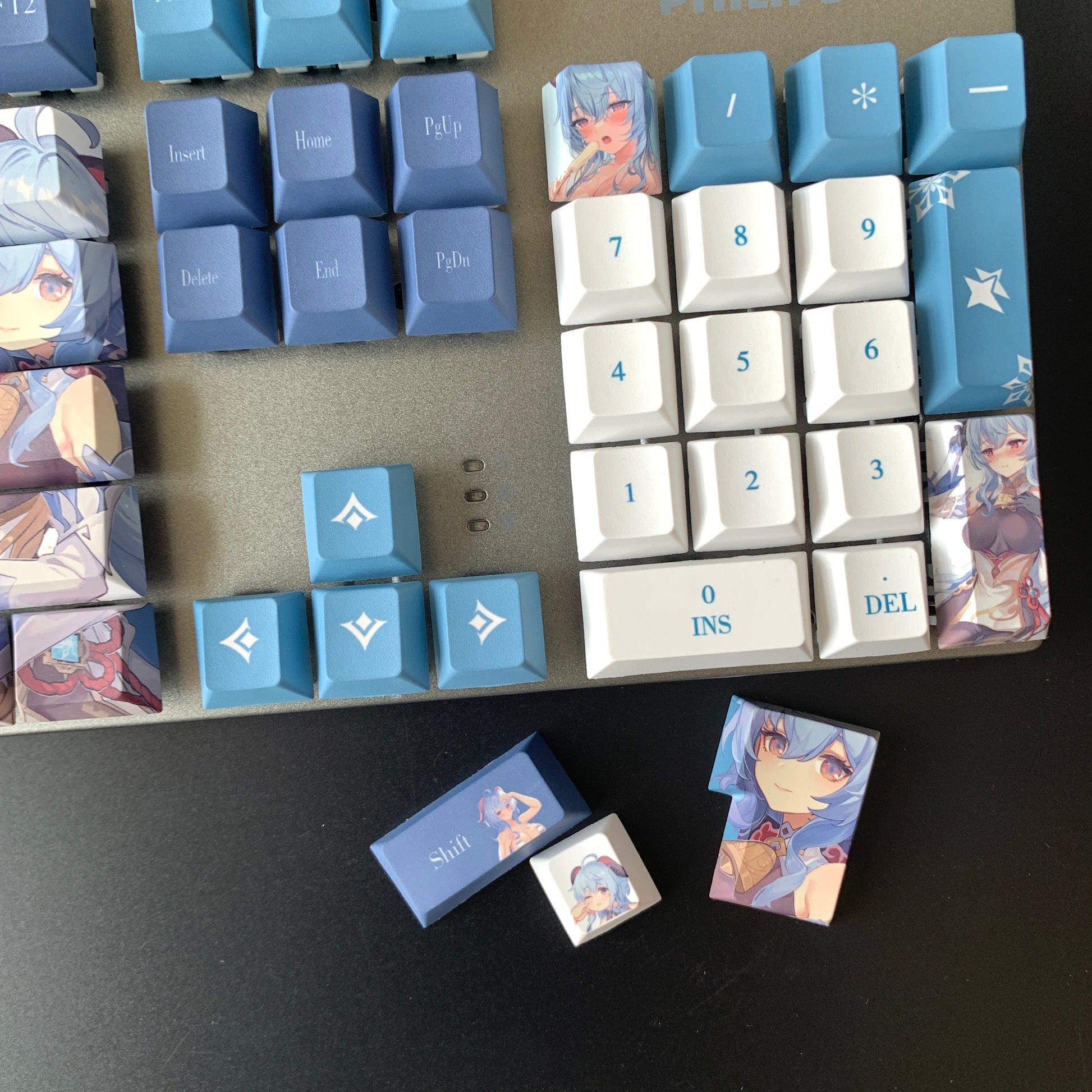 This mechanical keycaps set features various prints of Ganyu from the game "Genshin Impact" that are bound together with blue and white colouring.