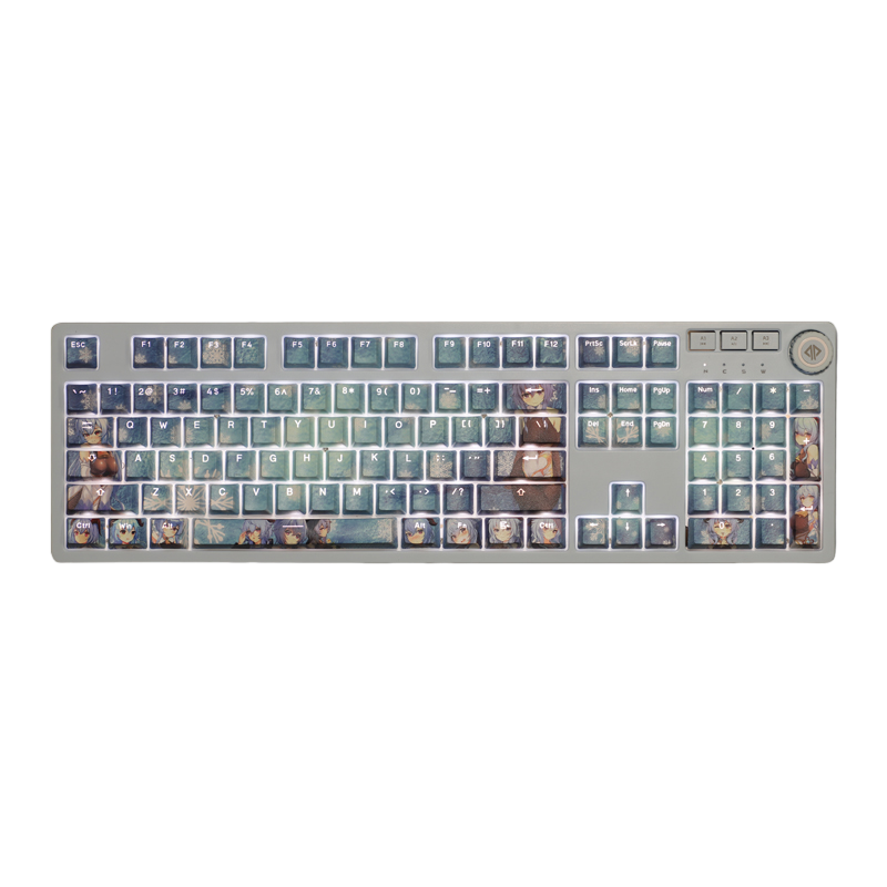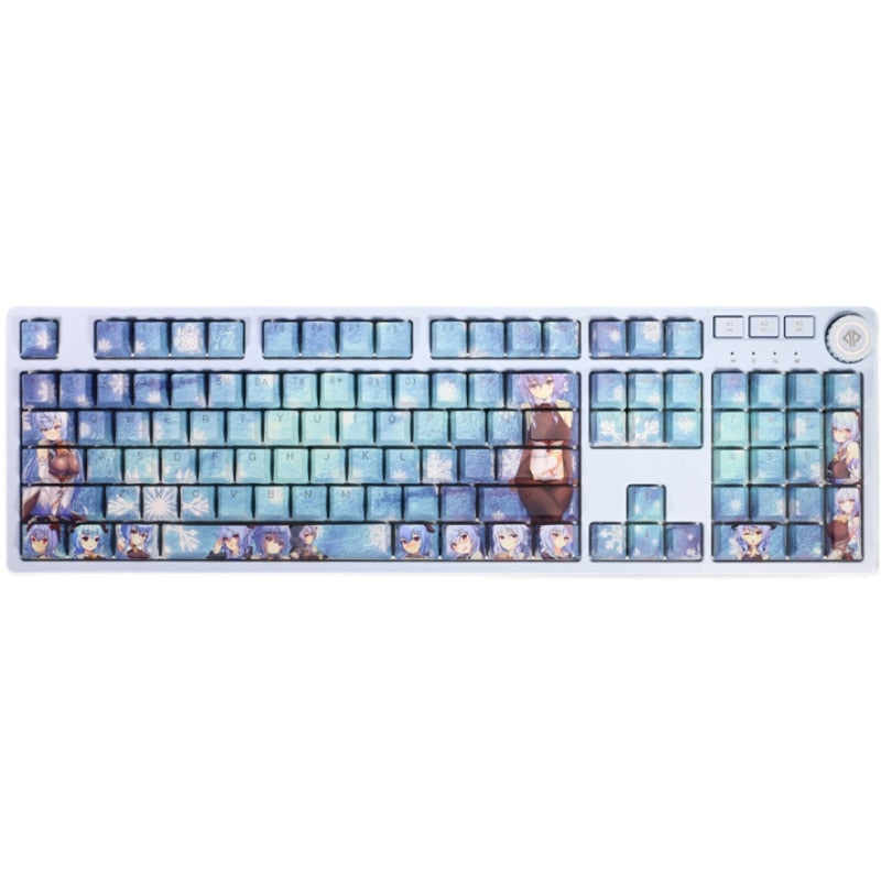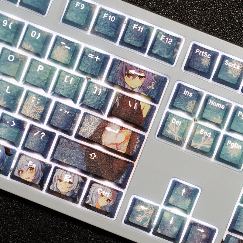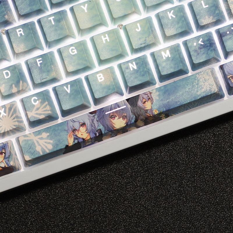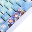 This mechanical keycaps set features various prints of Ganyu from the Game "Genshin Impact" that are bound together with blue colouring, combined with Backlit keycaps, Ganyu illuminates when LEDs pass through the keycaps.