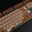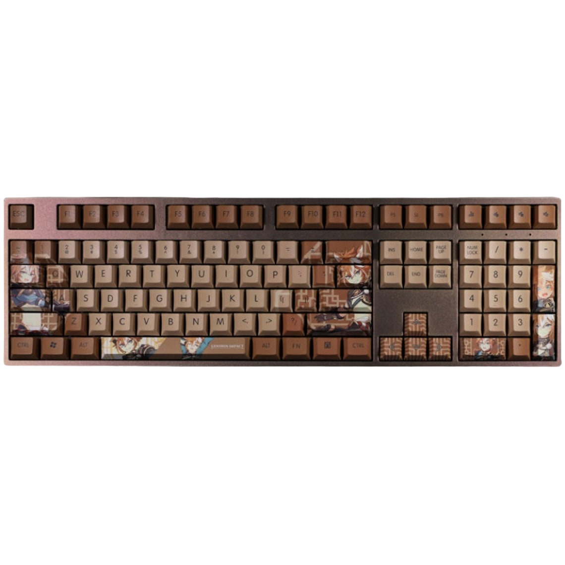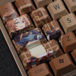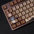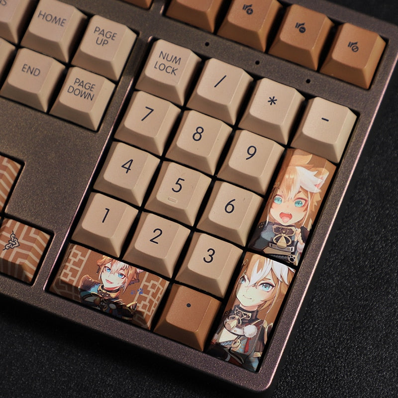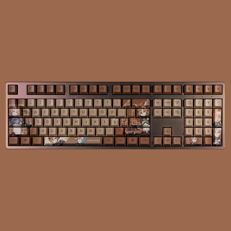 This mechanical keycaps set features various prints of Gorou from the game "Genshin Impact" that are bound together with brown and light brown colouring.