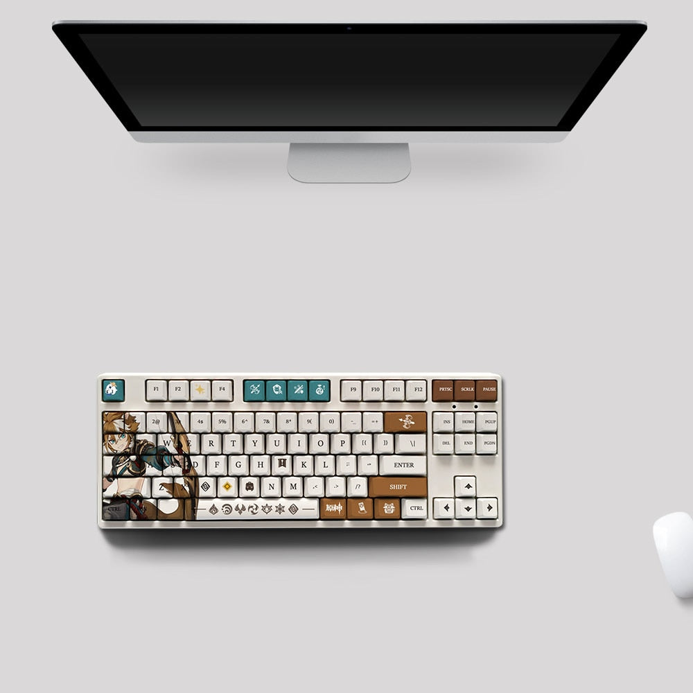 This mechanical keycaps set features various prints of Gorou from the game "Genshin Impact" that are bound together with white and brown colouring.