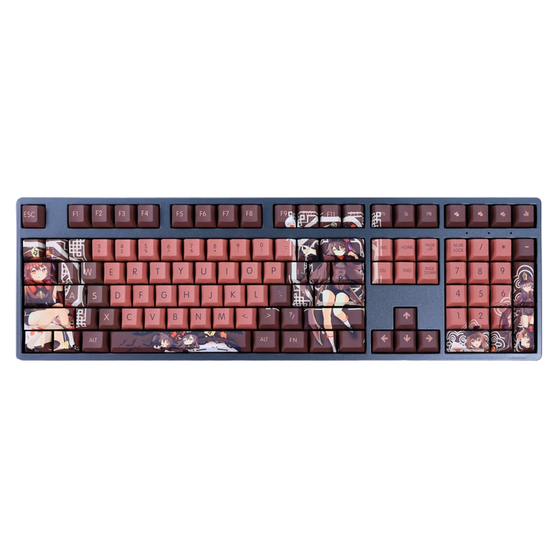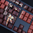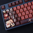 This mechanical keycaps set features various prints of Hu Tao from the game "Genshin Impact" that are bound together with pink and brown colouring.