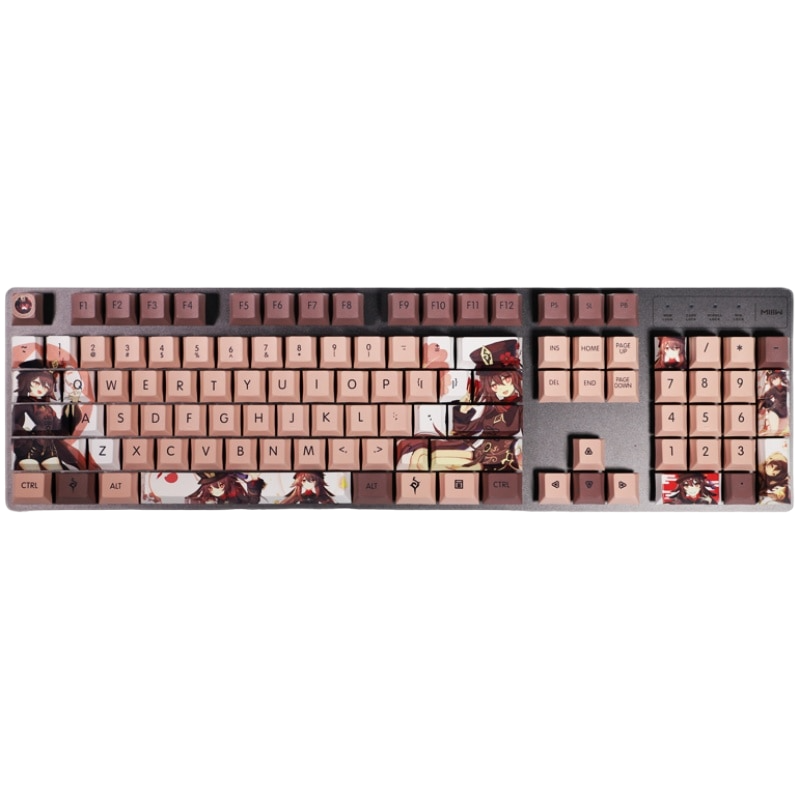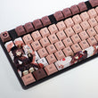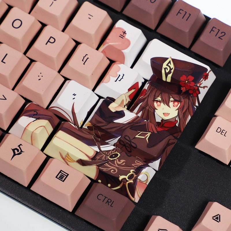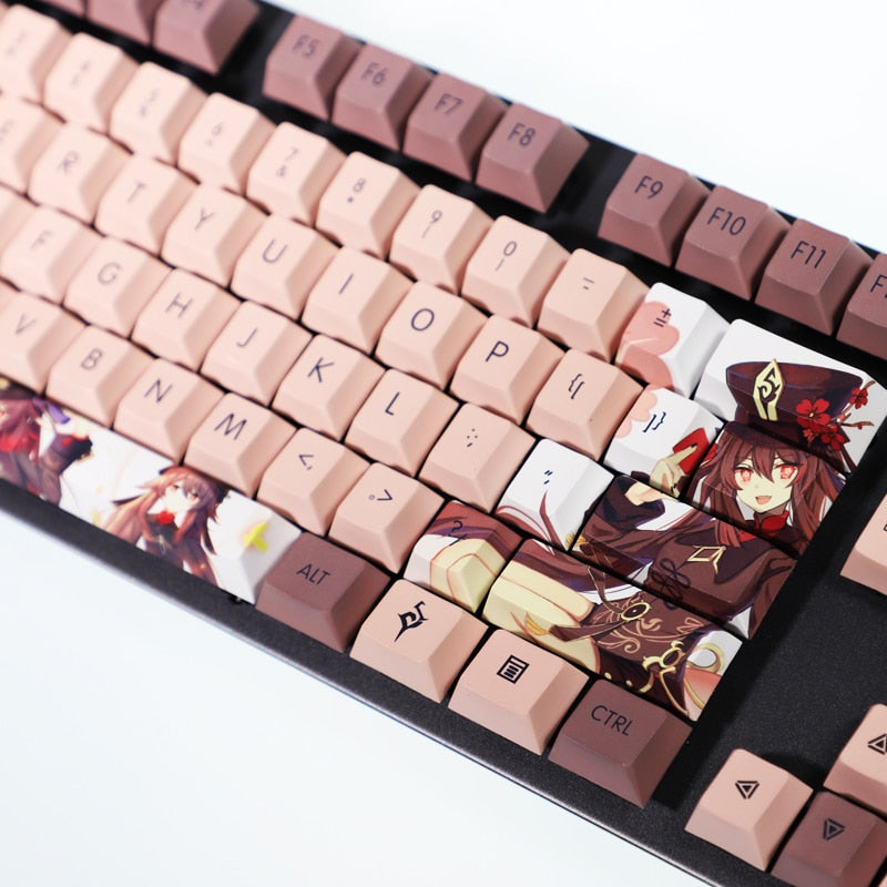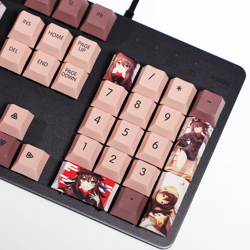 This mechanical keycaps set features various prints of Hu Tao from the game "Genshin Impact" that are bound together with pink and brown colouring.