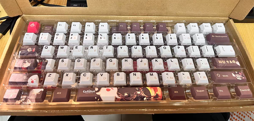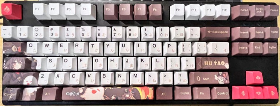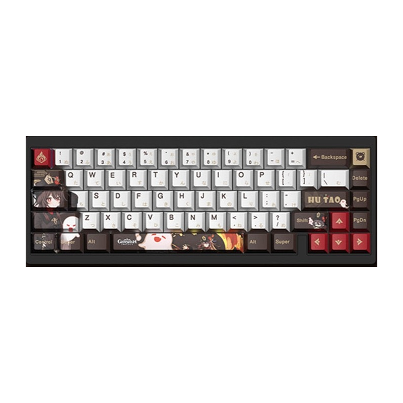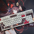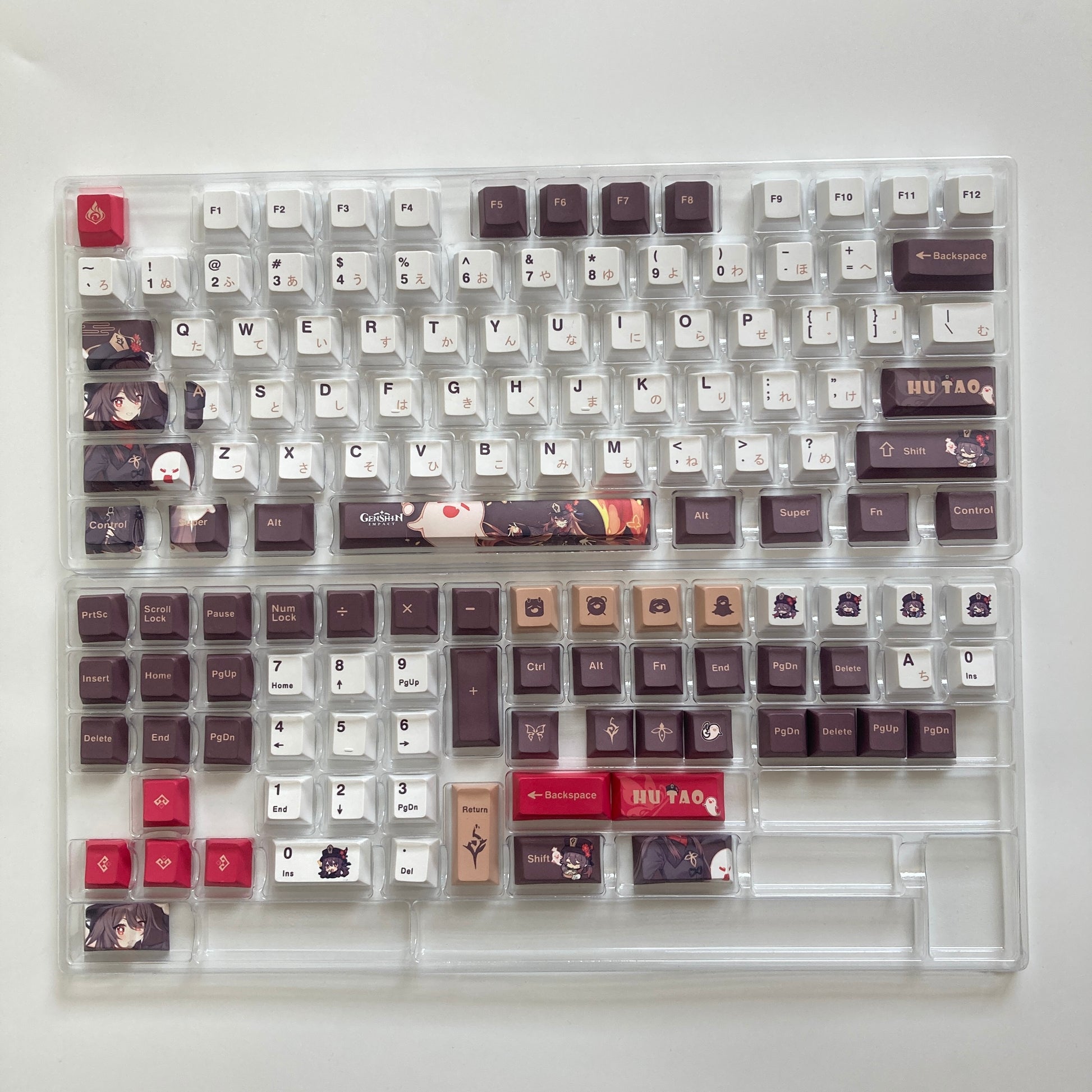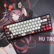 This mechanical keycaps set features various prints of Hu Tao from the game "Genshin Impact" that are bound together with white and brown colouring.