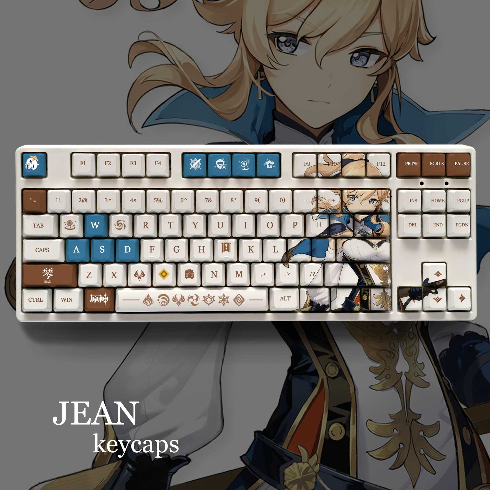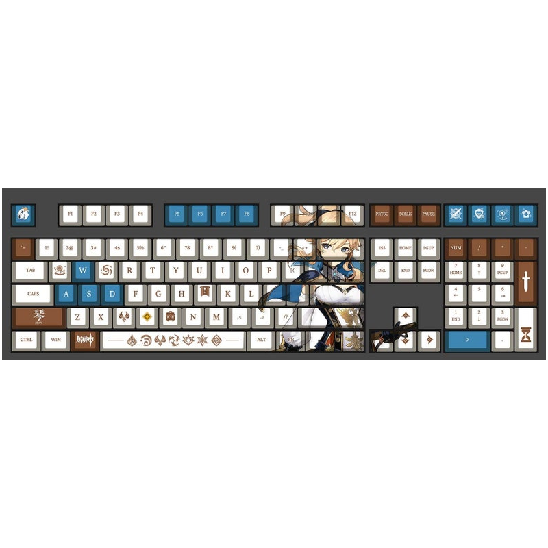 This mechanical keycaps set features various prints of Jean from the game "Genshin Impact" that are bound together with white, blue and brown colouring.