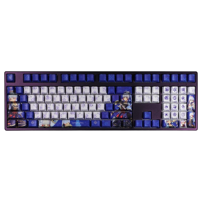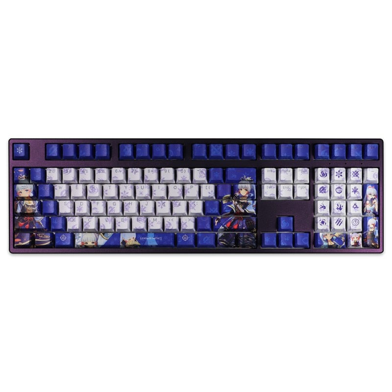 This mechanical keycaps set features various prints of Kamisato Ayaka from the Game "Genshin Impact" that are bound together with white and blue colouring, combined with Backlit keycaps, Kamisato Ayaka illuminates when LEDs pass through the keycaps.