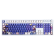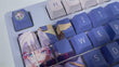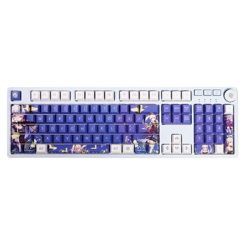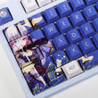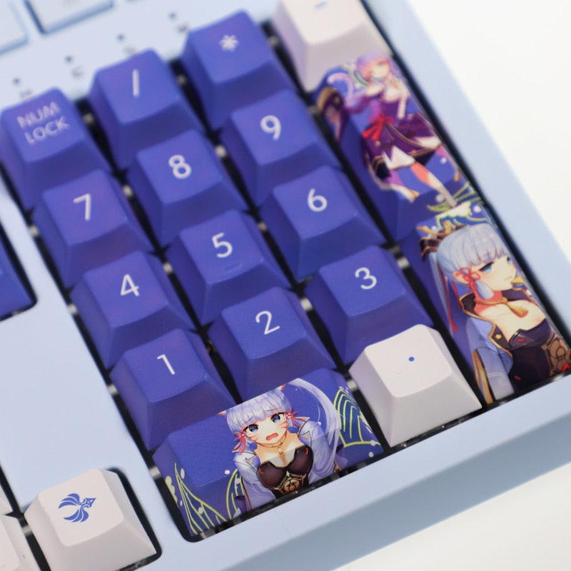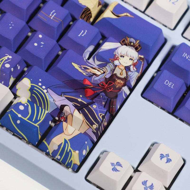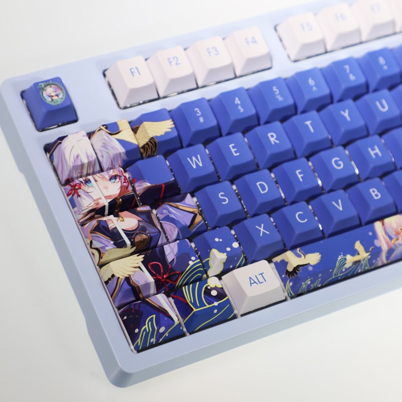 This mechanical keycaps set features various prints of Kamisato Ayaka from the game "Genshin Impact" that are bound together with dark blue and white colouring.