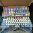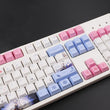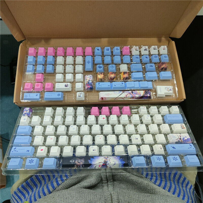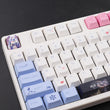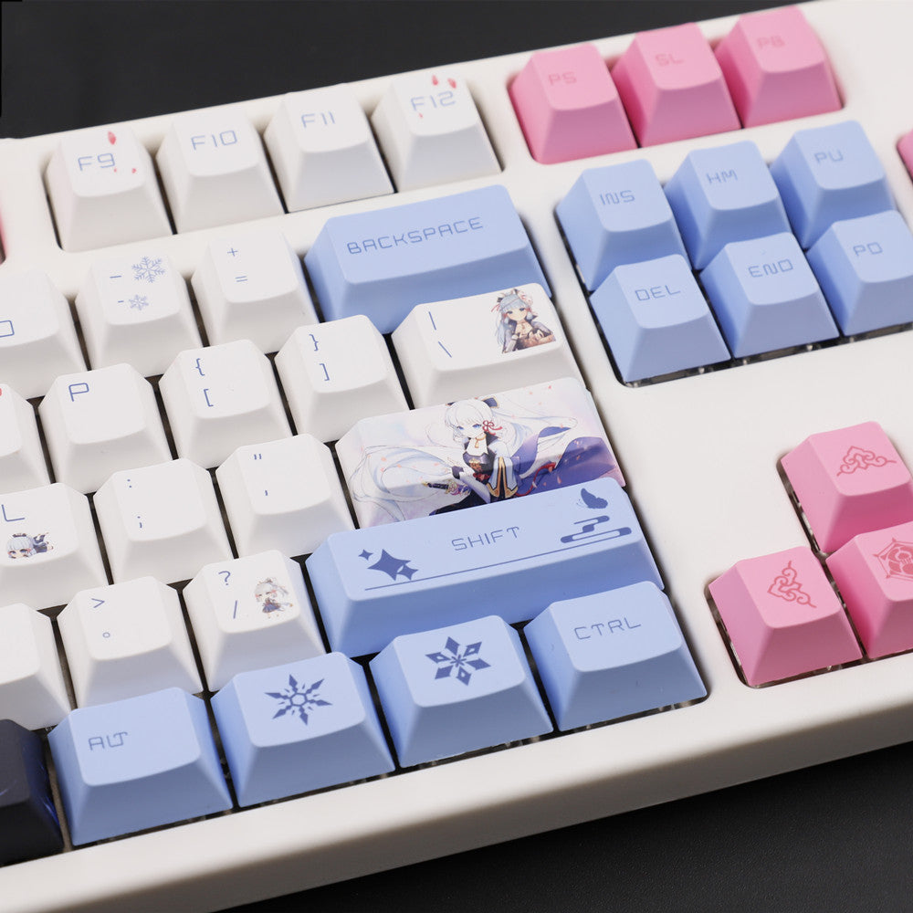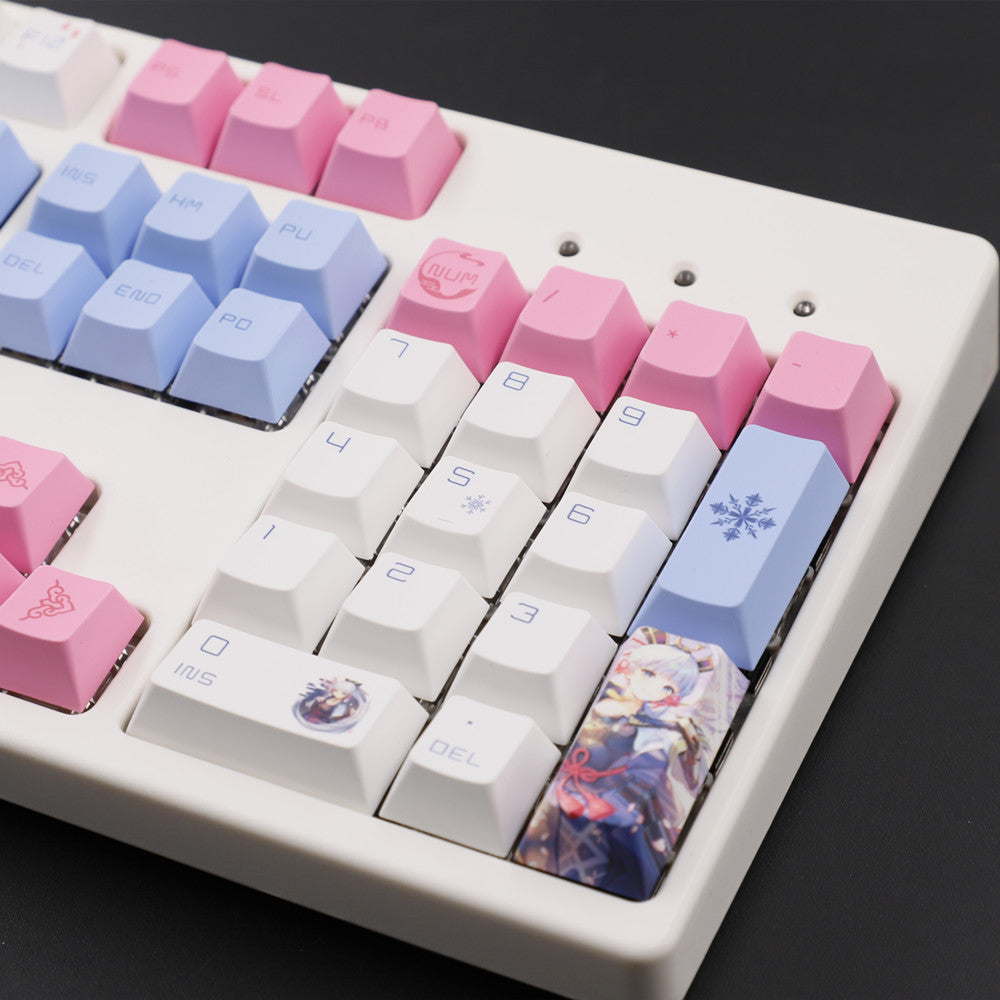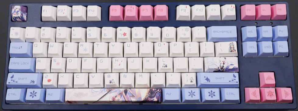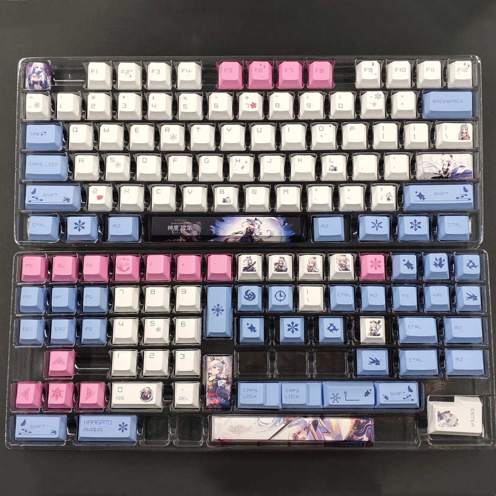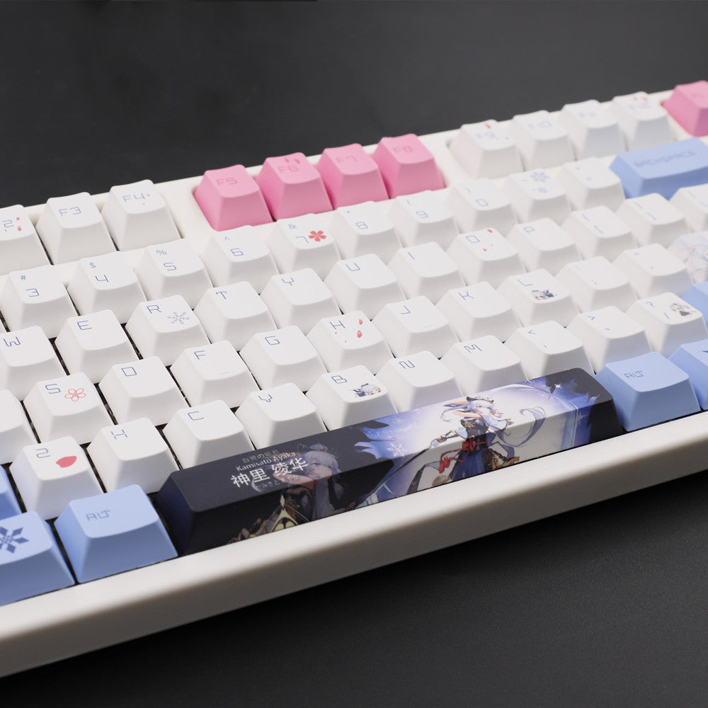 This mechanical keycaps set features various prints of Kamisato Ayaka from the game "Genshin Impact" that are bound together with blue, pink and white colouring.