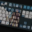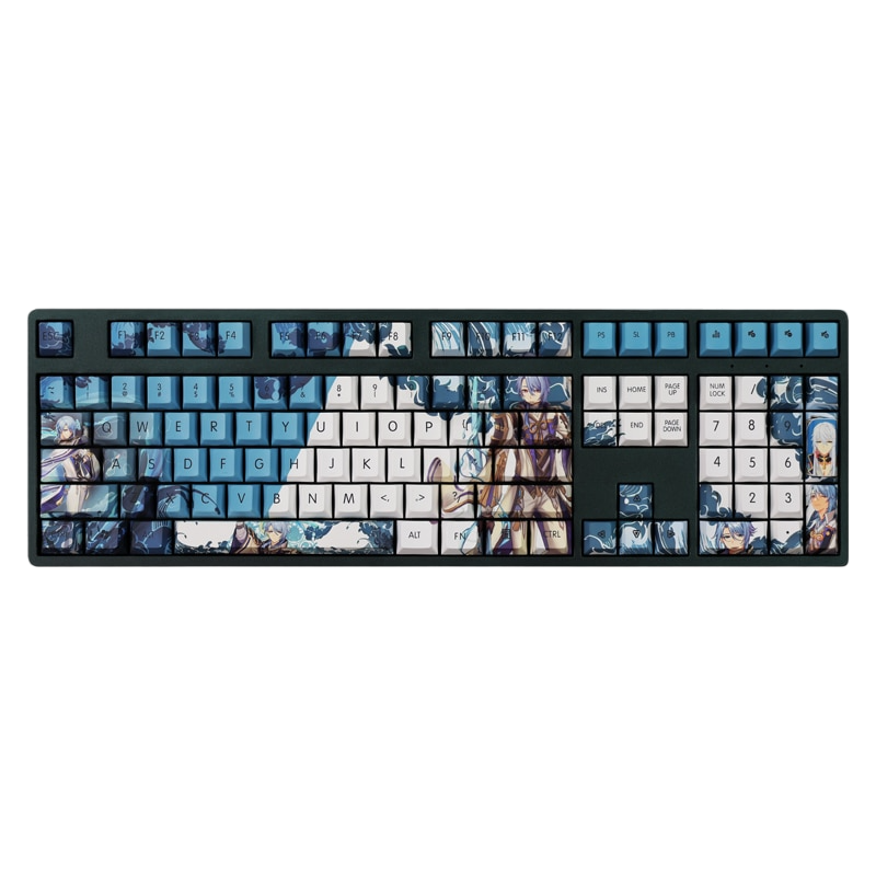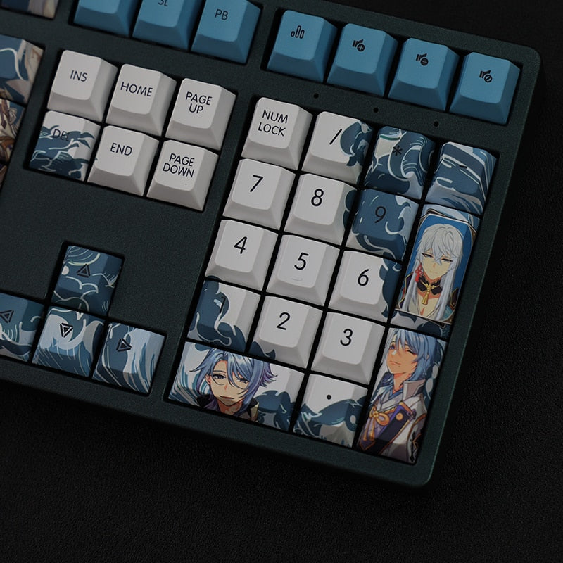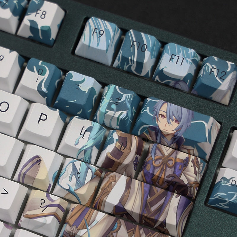This mechanical keycaps set features various prints of Kamisato Ayato from the game "Genshin Impact" that are bound together with white and blue colouring.